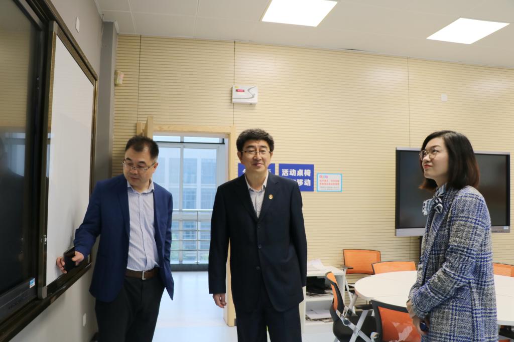 会后,在工作人员的陪同下,梁润生和党子奇参观了公司的互联网智慧教室、创新实验室、学业研讨室、报告厅、一站式办公大厅等。