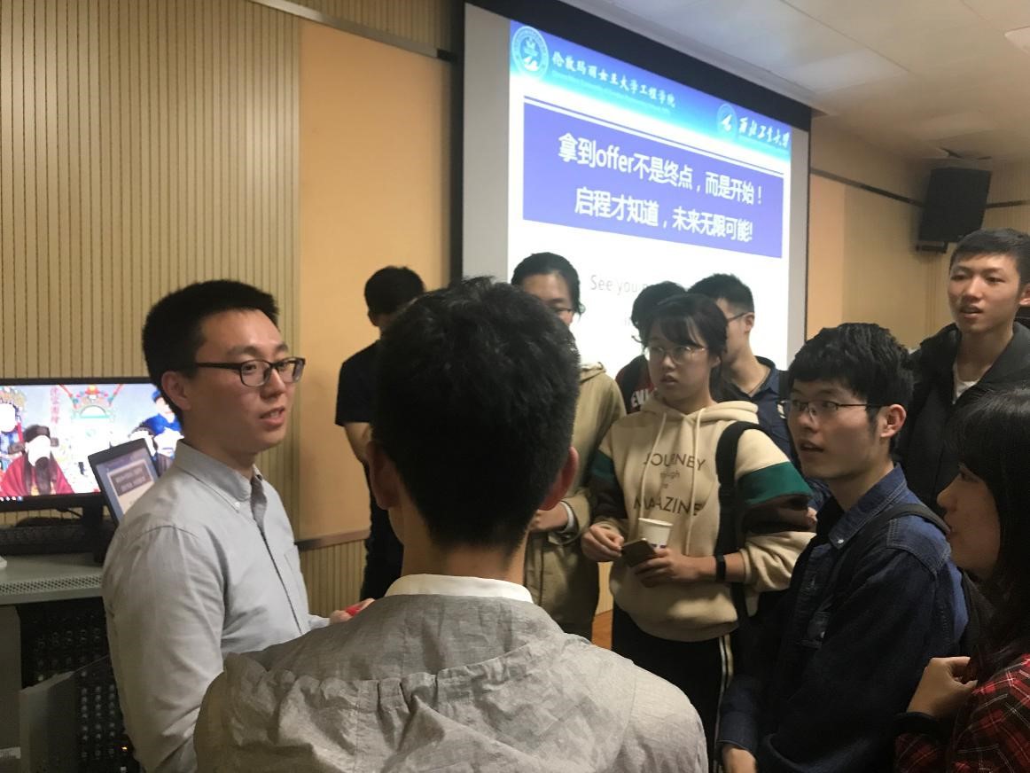 郑泽邦教授是公司材料公司优秀本科毕业生,并先后获得英国帝国理工公司先进材料科学与工程专业理学硕士和哲学博士学位,2018年9月通过西工大翱翔海外学者计划回到公司工作,具有丰富的专业知识和留学经验。郑教授结合自身实际经历按“个人简介、出国前、留学中、伦敦日常”四个板块,从“三个W(What, When, Where)和一个H(How)”四个方面,详细介绍了如何明确出国目标、选择研究方向和留学目的国,留学申请的关键时间节点,申请工作详细步骤和操作细节,以及奖学金的种类和申请办法等内容,并以真实数据对比分析了不同时间段留学和赴不同国家留学的优劣。郑教授还轻松幽默地与大家分享了自己在伦敦留学期间关于衣食住行的趣事和应付学习和生活困难的有效方法,同时强调了职工活注意事项。最后,郑教授指出“拿到offer不是终点,而是开始”,祝愿大家学有所成。