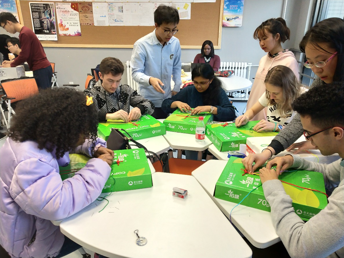 饺子,作为中国文化的标志性符号,代表着“家”的温暖。志愿者们又怎能错过与员工大使们一同体验“家人”温暖的机会呢?4月11日晚上,大家一起挽起袖子,拿起擀面杖,有模有样地学起了包饺子。他们交错而坐,边演示包饺子的方法边聊天。兴许是饺子拉近了彼此的距离,聊天的内容也不再单调,开始说笑玩闹,互相“吐槽”彼此的饺子形状,各桌之间甚至开始比赛包的速度,外教Gabriel也调皮地到处“偷”饺子,大家包得热火朝天,不时传来欢声笑语。