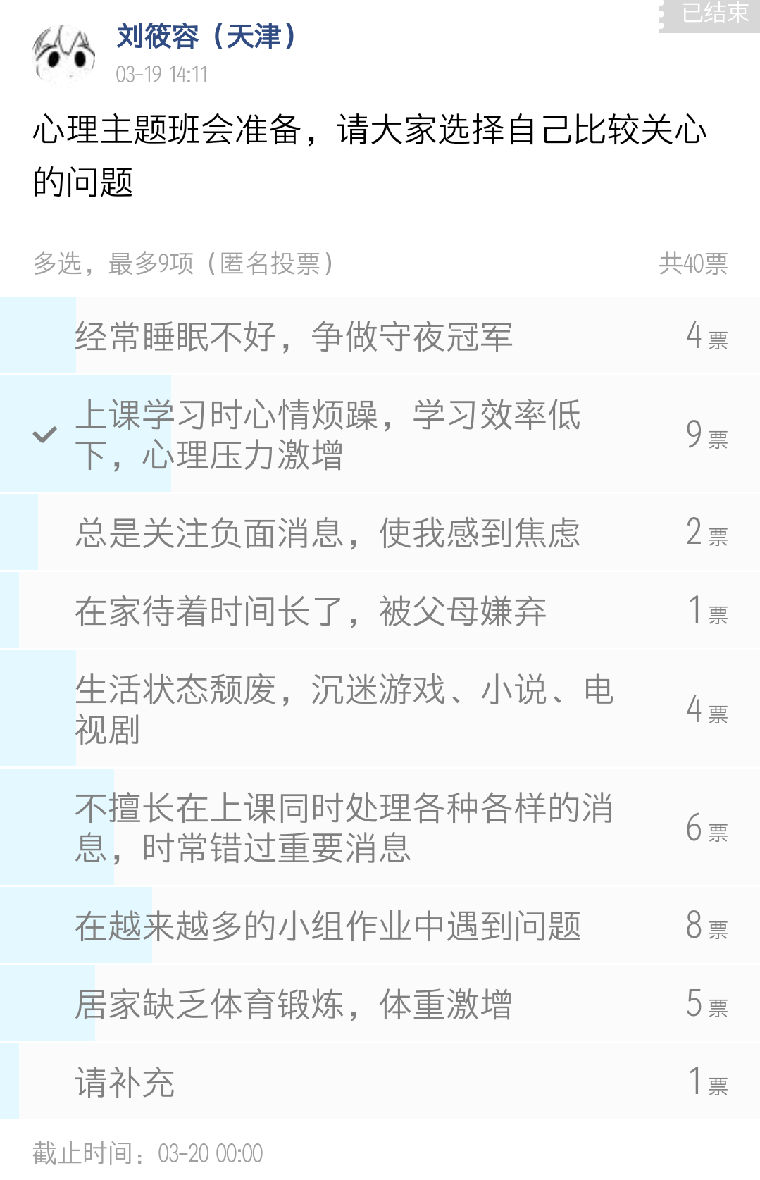 QM011905班会前组织了投票来征集同学们对班会的建议。根据投票结果和普遍程度,将问题分成了三类,其中普遍度最高的问题集中在线上学习方面,例如授课平台分散、签到和上课不能同步、上课时不断有消息弹出,影响上网课的授课效果等。