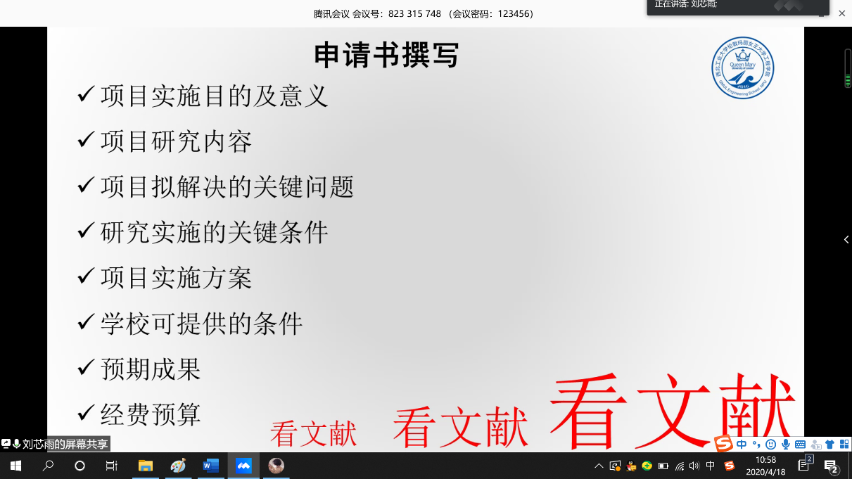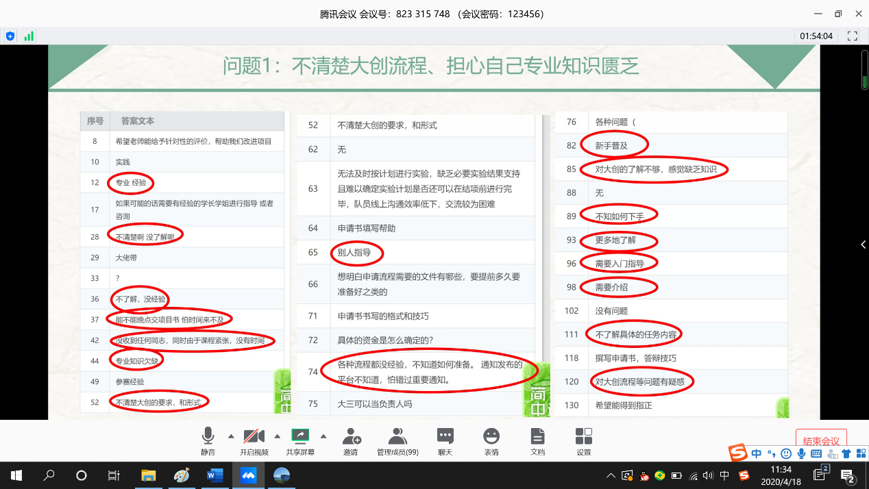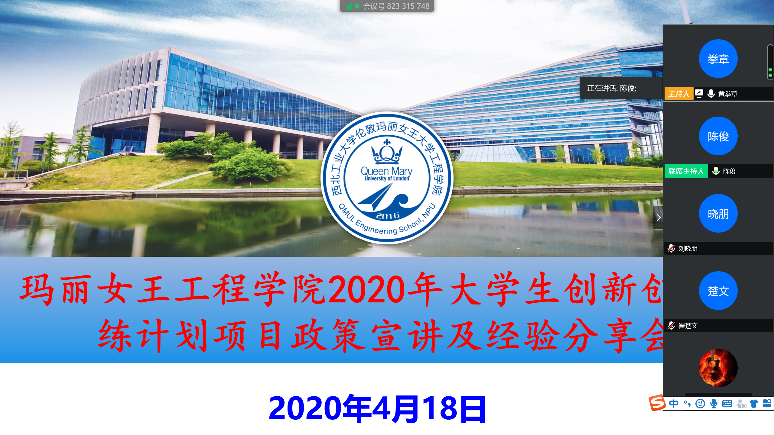 2020年4月18日上午,bevictor1946韦德官网“大创政策宣讲及经验分享会”在“云端”成功举行,公司副经理范晓丽、陈俊,员工事务办公室黄拳章,教学办公室丁静以及100多名员工参与了分享会。分享会由陈俊主持。