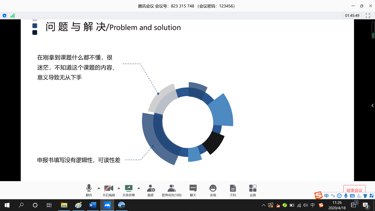 何沐锟同学详细介绍了参与“大创”项目的流程和必要条件,结合参加“大创”的创业实践项目和互联网+大赛的亲身经历,重点分享了如何确定合适的项目名称、如何写好一篇商业计划书以及如何在答辩中打动评委等宝贵经验。李昀格同学介绍了“大创”项目申报、答辩以及项目实施过程中的一些常见问题,并强调了花大量时间做试验的重要性,希望想要做“大创”的学弟学妹们敢于创新,敢于面对未知的挑战。刘芯雨同学介绍了自己在做“大创”项目中的体验和学到的经验教训,并特别强调了多看文献和详细规划试验并做好试验记录的重要性,希望大家把握好寒、暑假的时间,同时也要做好应对“大创”过程中遇到各种问题,如进度可能不如预期等的心理准备。柳宇轩同学重点分享了自己写“大创”申请书的经验,强调了书写格式中字体、标题、符号和物理量单位等同学们容易出错的问题,同时建议同学们在做“大创”的前期要做好项目规划,以便于妥善安排时间。王婷翌同学从自己负责的项目出发,强调了申请“大创”项目应提前做好准备的重要性,并特别分享了自己针对不同分辨率电脑准备两份PPT的小经验和答辩逻辑清晰远比PPT做的漂亮更重要的观点。肖卓睿同学将公司“大创”问卷调研中同学们反馈的问题分为三类,并根据自己申请和做“大创”项目的实际情况详细回答了上述三类问题。针对“大创”申请和答辩环节中的一些注意事项,他建议学弟学妹们最好提前掌握“大创”过程中所需要使用的软件,以便做到游刃有余。