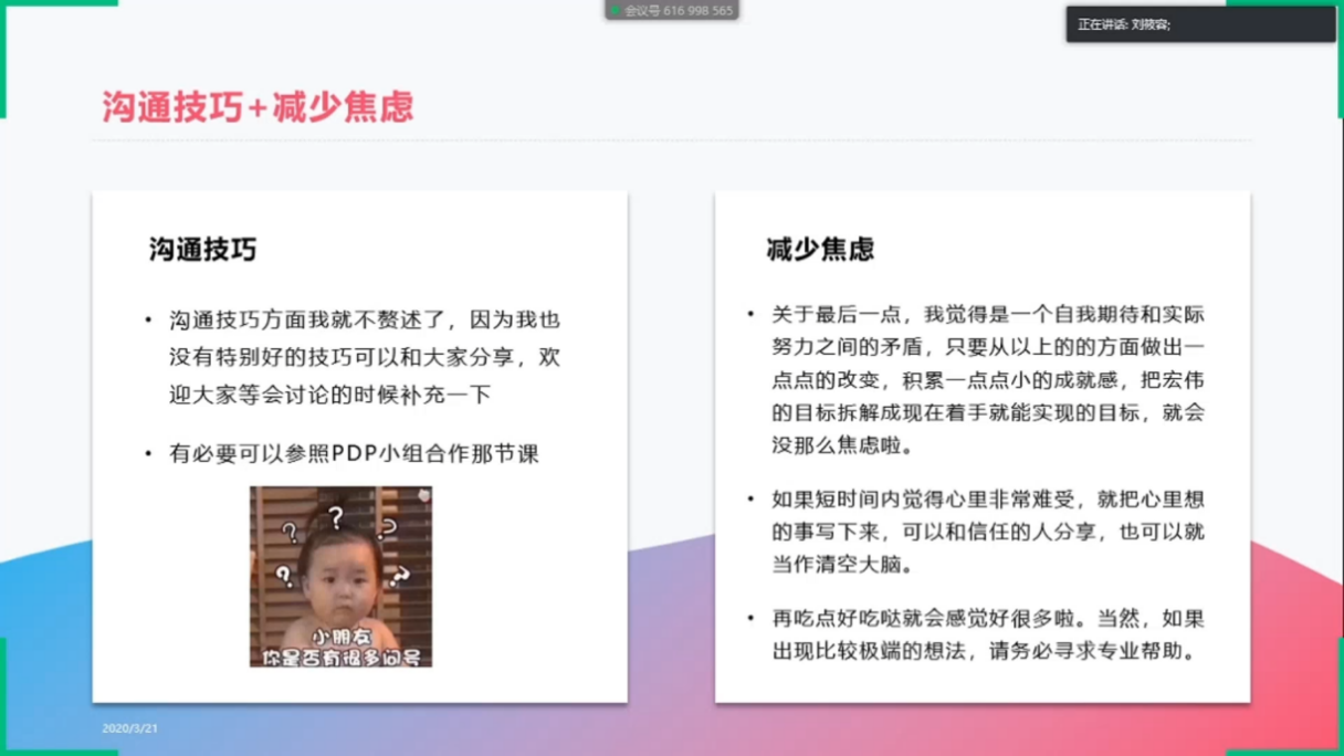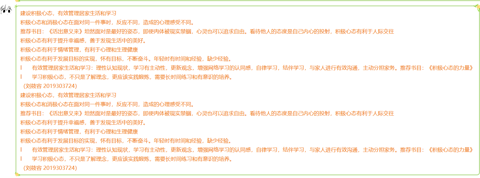 在积极向上的心理健康教育氛围中,2020年3月21日,在心理委员的组织下,QM011905团支部开展了主题为“安心定志,你我同行”的线上心理主题班会活动,进一步提升了同学们的心理健康水平。同学们借此树立了更加积极进取的心态,能更从容地面对居家网课学习。