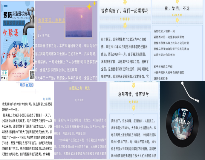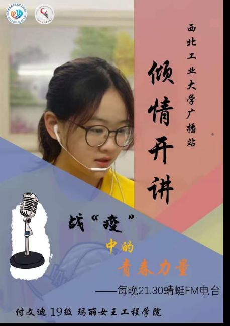 付文迪参与了多项抗击疫情公益宣传活动。参与录制校广播站抗疫配乐诗朗诵《我们一定胜利》;作为朗读者参与西北工业大学广播站在蜻蜓FM推出的《战“疫”中的青春力量》;温纪元组织同学参加疫情征文活动,并积极参与志愿活动,为居民提供服务,感恩社区工作者;翟珉梓积极了解同学们的心理状态,推送心理讲座信息,鼓励、关怀同学,疏导同学们的心理压力。