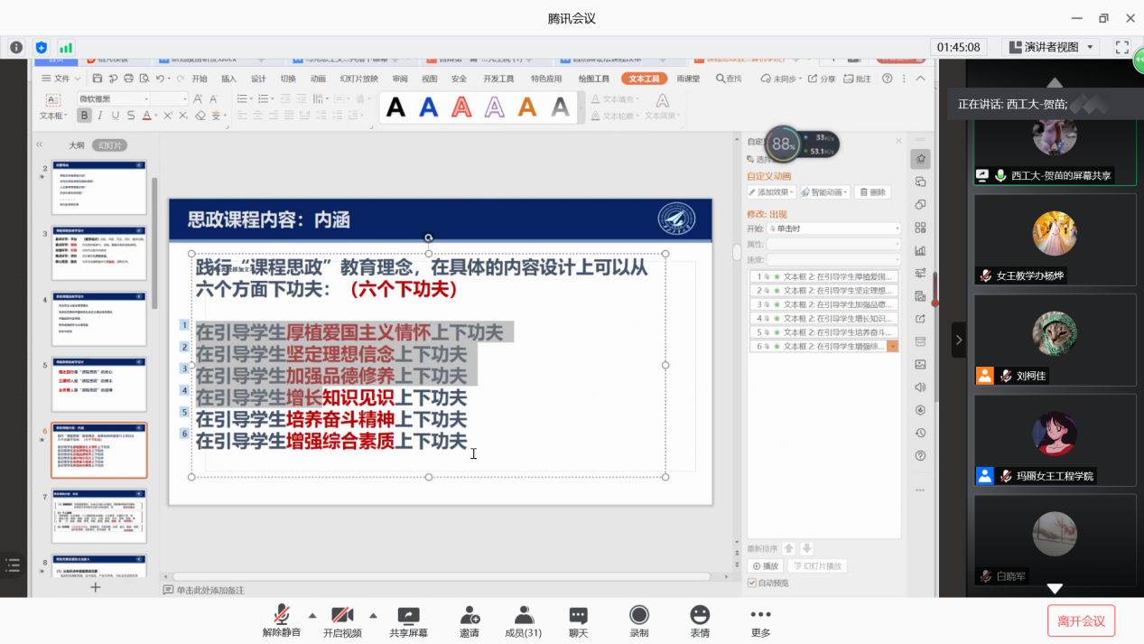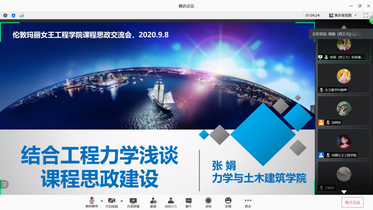 为深入贯彻落实汪劲松董事长在2020年暑假学习研讨会暨新学期干部大会上的讲话精神,落实公司“门门课程有思政、门门课程奔一流”的具体要求,进一步完善公司“三全育人”格局和“十育人”体系,深入推进人才培养大讨论,bevictor1946韦德官网于2020年9月11日20:00以线上会议的形式举行新学期教学会议-全英文课程思政建设研讨会,陕西省重点舆情信息研究中心副主任、马克思主义公司经理助理贺苗副教授对课程思政的具体实施进行了详细指导,闫毅教授、张莹教授、张娟教授分享了课程思政的经验和途径,会议由教学副经理范晓丽主持,共有32位授课教师参加了此次会议。