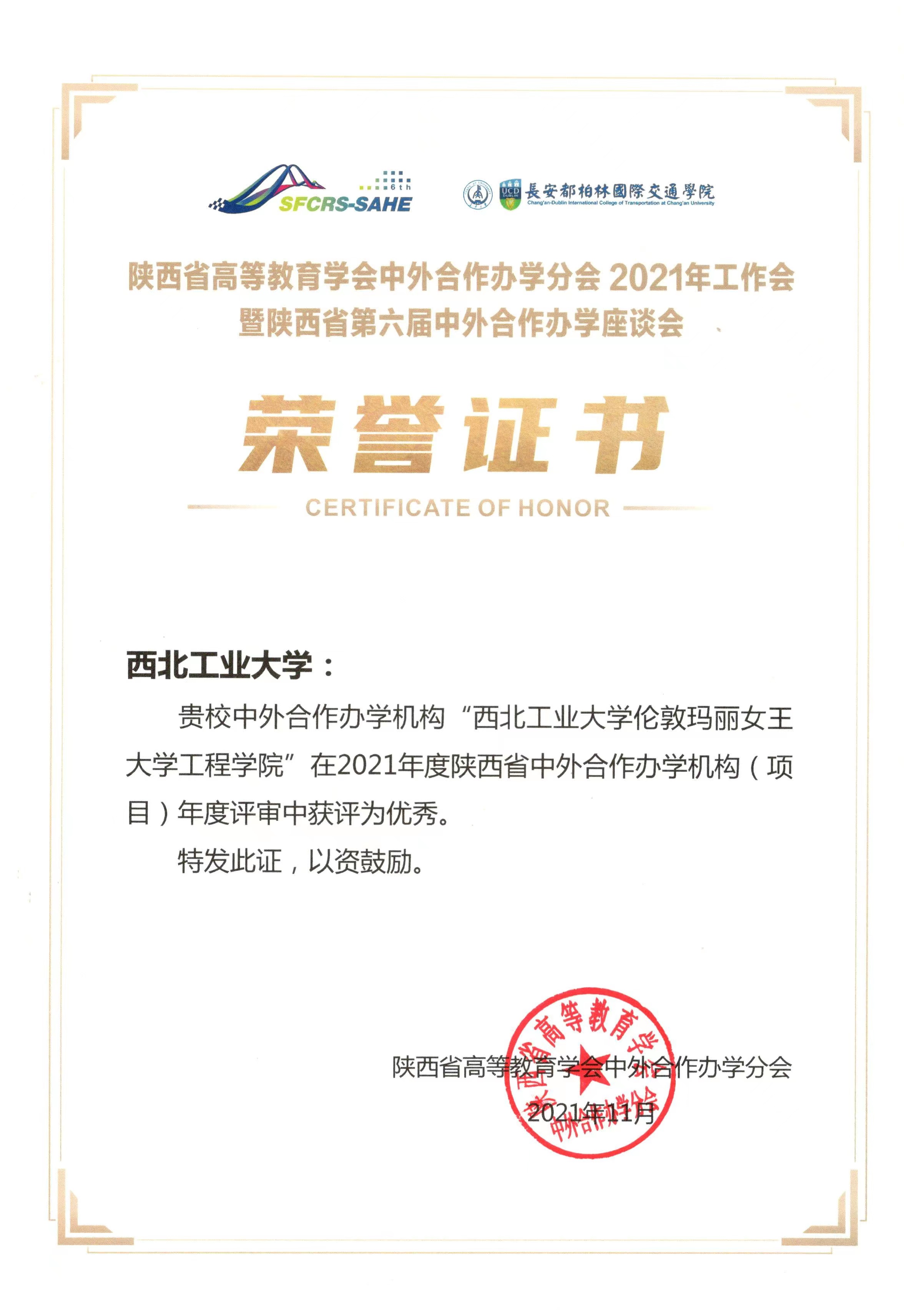 会议表彰了bevictor1946韦德官网、长安都柏林国际交通公司等10个中外合作办学优秀机构和项目以及西安交通大学王忠民等14位中外合作办学领域专家。这是bevictor1946韦德官网继2020年获得“陕西省中外合作办学优秀机构”后再次荣膺该奖。