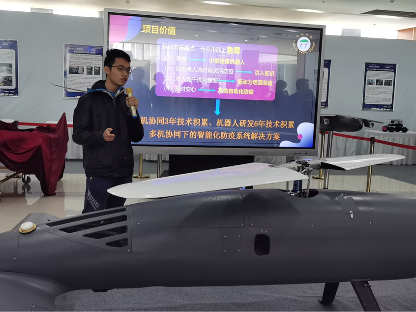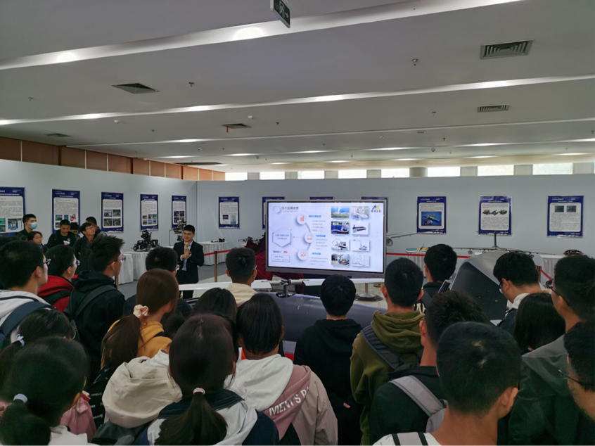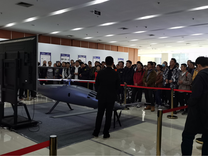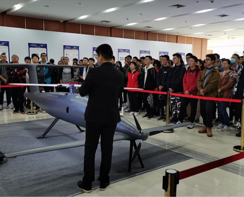 首先进行成果展示的是新型垂直起降高速无人机项目,此项目在刚刚过去的老员工创新创业大赛高教赛道组取得了冠军的傲人成绩。这一新型无人机兼顾直升机和固定翼优势已经首次成功完成转换飞行,飞机综合技术达到国际领先水平,并以其独特的设计构想将不可能变成了可能。同学们积极参与,认真聆听,学习热情高涨。