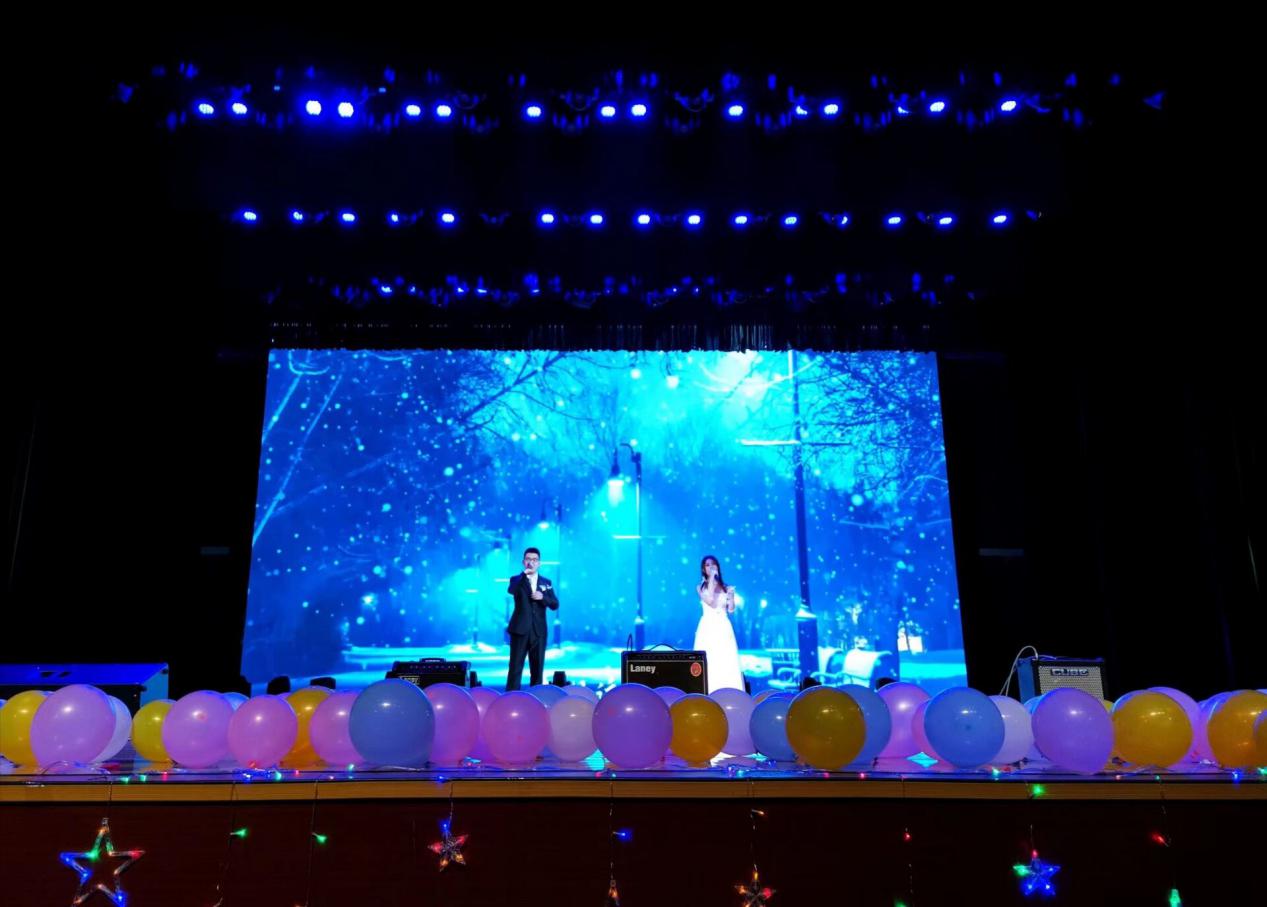 洁白的雪花在空中缓缓飞舞,迎新晚会的梦幻气氛从开场便展现出来。脚踩夜幕中皑皑的白雪,经过翱翔员工活动中心前的巨幅海报,踏上熠熠生辉的彩灯阶梯,拥抱过晚会现场的吉祥物,仿佛置身于我们自己的青春殿堂,接过荧光棒,在签名板上留下自己的名字,戴上独特的幸运手环,怀揣获奖的热切期待,同学们迅速融入了本次晚会热烈欢乐的氛围。