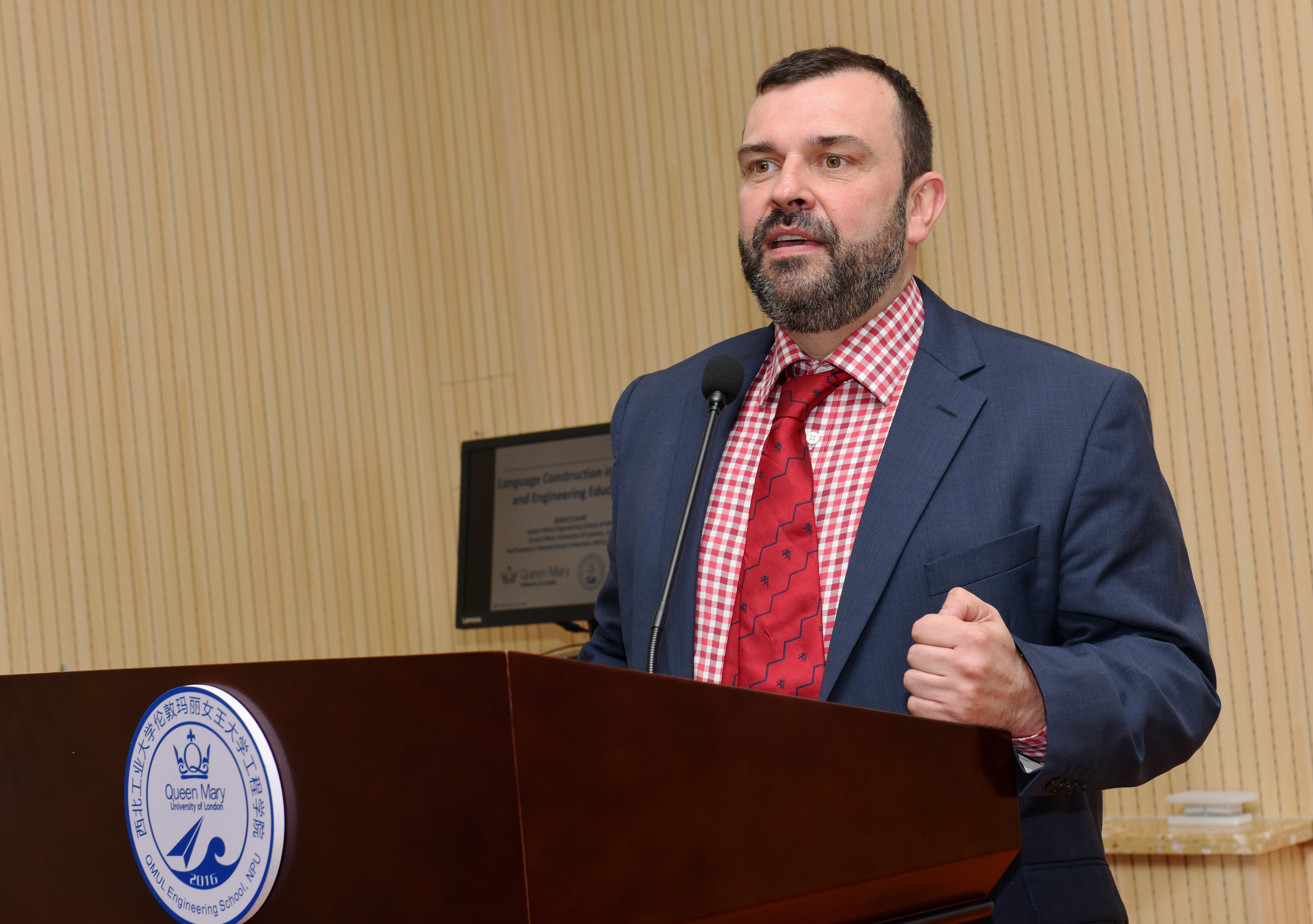 ICTL英方主任GabrielCavalli博士的报告主题为“提升员工语言能力在工程教育的具体实践”。他以QMES为载体和范例,介绍了在多语言环境下,语言、文化、工程教育如何交叉相融,特别强调了语言在工程教育中不可或缺的作用。