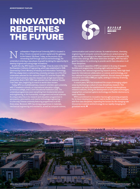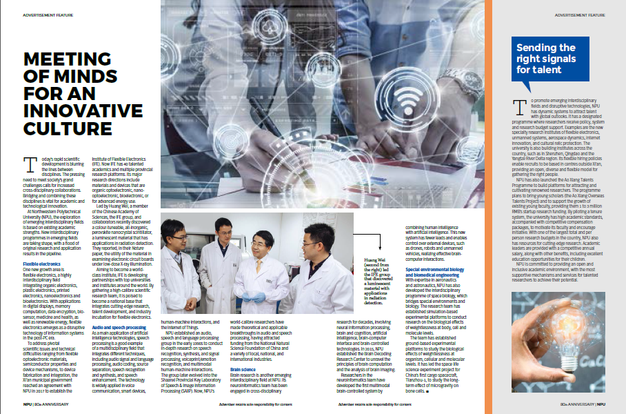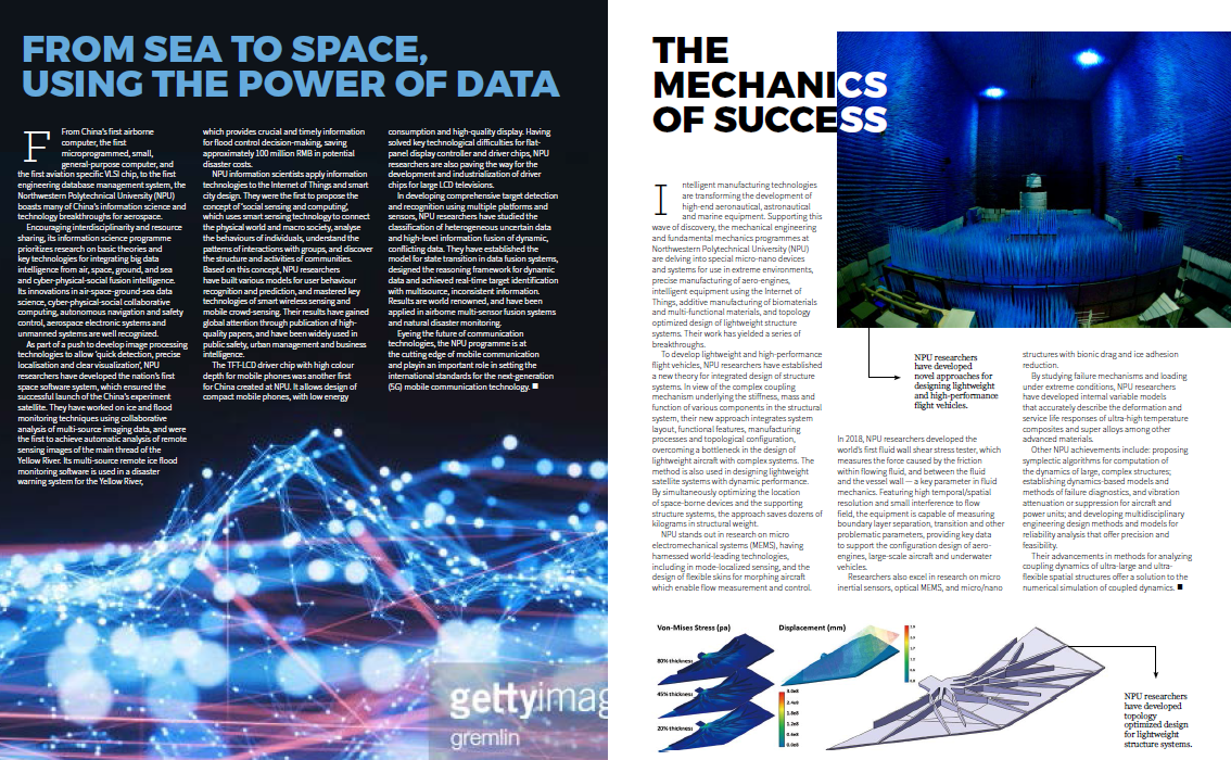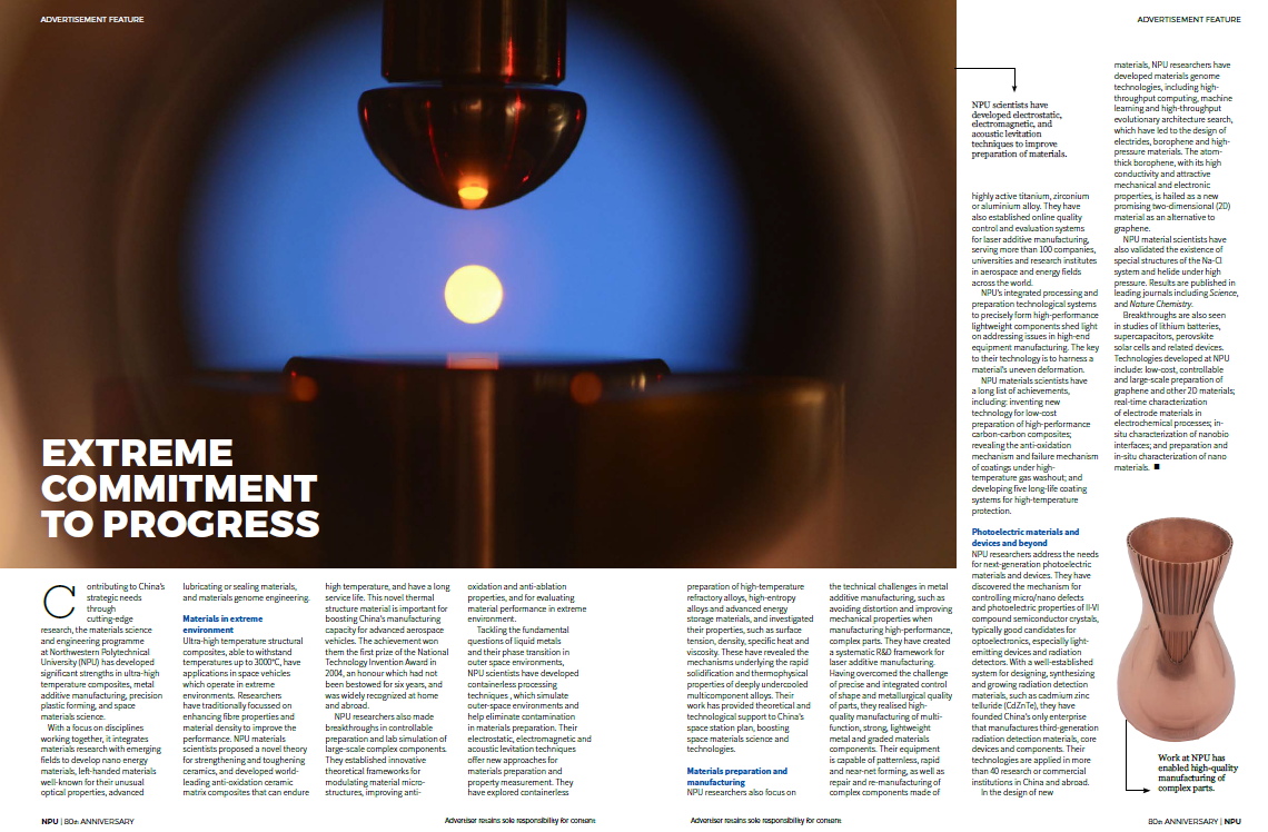 《自然》(Nature)杂志用8页的篇幅重点介绍了西北工业大学航空宇航科学与技术、船舶与海洋工程、材料科学与工程、机械工程及其力学基础、信息科学等优势学科及柔性电子、语音识别、脑科学、特殊环境生物学和生物医学工程等新兴学科方向。同时,还向全世界的科技工作者宣介了西北工业大学的人才政策。
