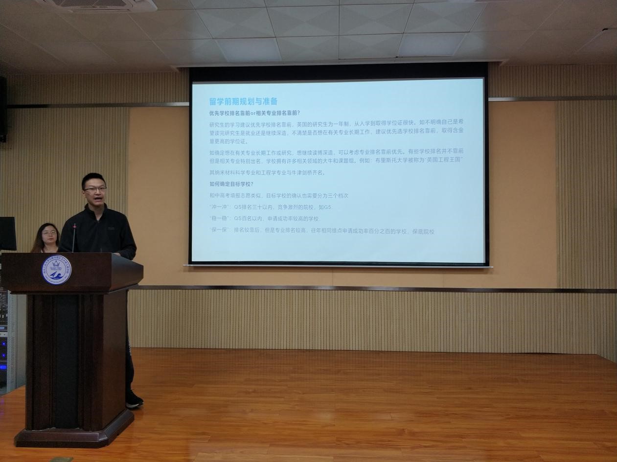 陈睿超同学曾有两次英国学习实践经验,获伦敦大学公司冬令营优秀结业证书和知名教授推荐信。目前已获得英国帝国理工公司、伦敦大学公司、曼彻斯特大学等9所世界一流大学的录取通知书。报告会上,陈睿超介绍:他结合SWOT模型分析自己的优劣势,充分做到科学择校,理性择校,详细解读了如何规划自己的留学方向,怎样写出更加出彩的PS和推荐信,并分析名校申请过程中的关键节点。整个分享过程,可谓干货满满。