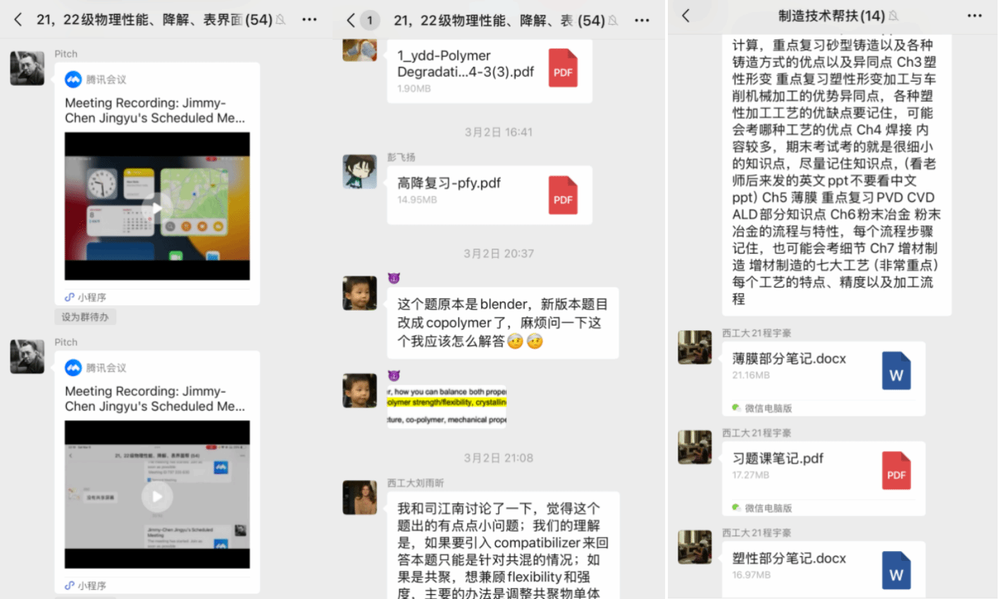 在春季学期补缓考辅导中,工作团队志愿者们完成了对高分子物理性能、表界面、高分子降解、断裂力学、制造技术5门课的补缓考辅导,课上针对考试重难点问题进行了深入剖析与讲解,课下帮助同学们进行一对一答疑解惑,为顺利通过补缓考保驾护航。