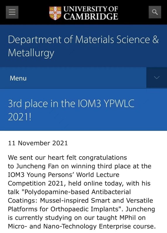 该项比赛于2005年首次举行,长期以来备受世界学术界关注。范峻丞作为唯一一位在读硕士且非英语母语的选手,与来自英国、南非、俄罗斯、马来西亚和加拿大的博士生同场竞技,难度可想而知。他以“聚多巴胺抗菌涂层:以蚌类为灵感的骨科植入智能多功能平台” (Polydopamine-based Antibacterial Coatings Mussel-inspired Smart and Versatile Platforms for Orthopaedic Implants )为参赛课题,由西北工业大学李鹏教授、伦敦玛丽女王大学Liz Tanner教授和Maria Romero-Gonzalez博士共同指导,是极少数以出色的本科阶段研究成果入围全球决赛的员工之一。最终他顶住巨大压力,自信地侃侃而谈,讲解了课题并接受了评委们的提问,最终斩获季军,并收获现金和新版Macbook 笔记本电脑的奖励。而更令他骄傲的,是自己的名字登上了剑桥大学的官网,喜提热搜。