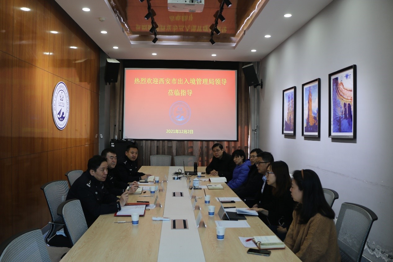 孔杰经理向张桐政委一行来公司调研表示热烈的欢迎,对西安市出入境管理局长期以来对公司外籍教师签证办理相关工作的支持表示感谢。张桐政委将我市出入境管理局在过于一年的工作给各位老师做了简要汇报。近年来,出入境管理局不断转变工作作风,提高服务意识,把“我为群众办实事”落实到具体工作。