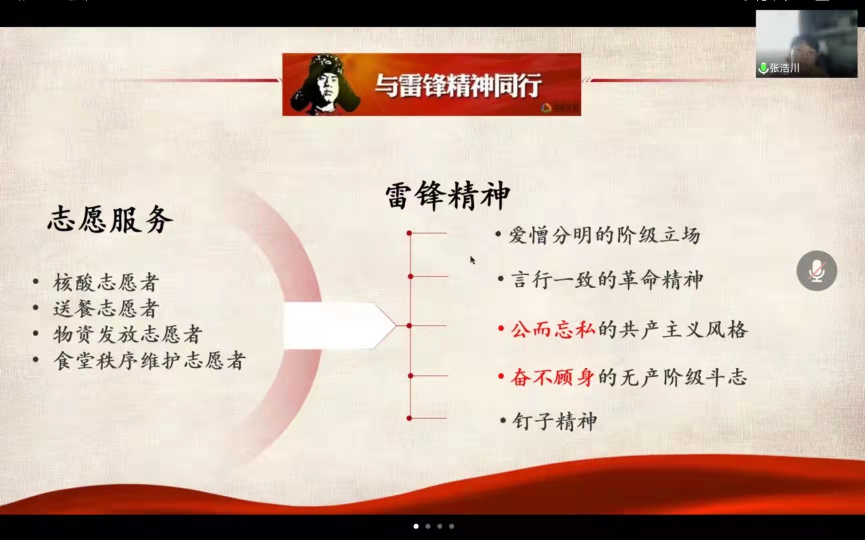 此次学雷锋主题活动主要由启动仪式和学雷锋特色志愿服务系列活动组成。3月13日下午,雷锋精神主题活动启动仪式在线上举行。首先,主持人刘哲宁向参会同学介绍了活动的具体内容和参加方式,随后宋静怡、焦天奥等几位志愿者骨干从不同角度向大家分享了疫情防控以及十四运志愿服务的经验和心得,他们以实际行动向同学们展示了什么是“雷锋精神”。最后,院团委书记黄拳章老师表示:雷锋精神是中华民族传统美德的积淀,是把有限的生命投入到无限地为人民服务中去,是干一行爱一行、立足本职工作艰苦奋斗的精神,是随着时代进步而不断发展的与时俱进的精神,希望广大同学认真学习雷锋精神,常学常新,持之以恒。