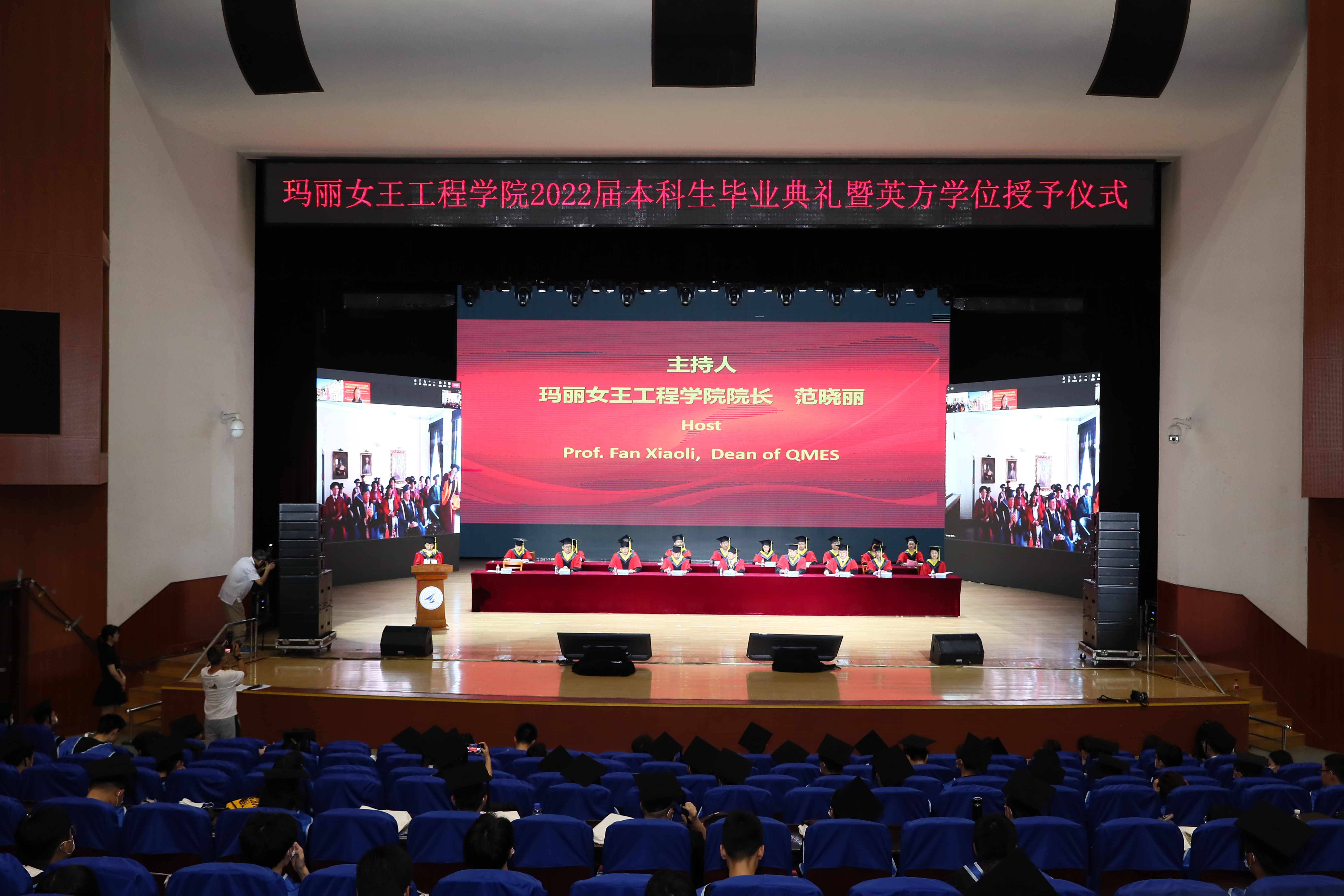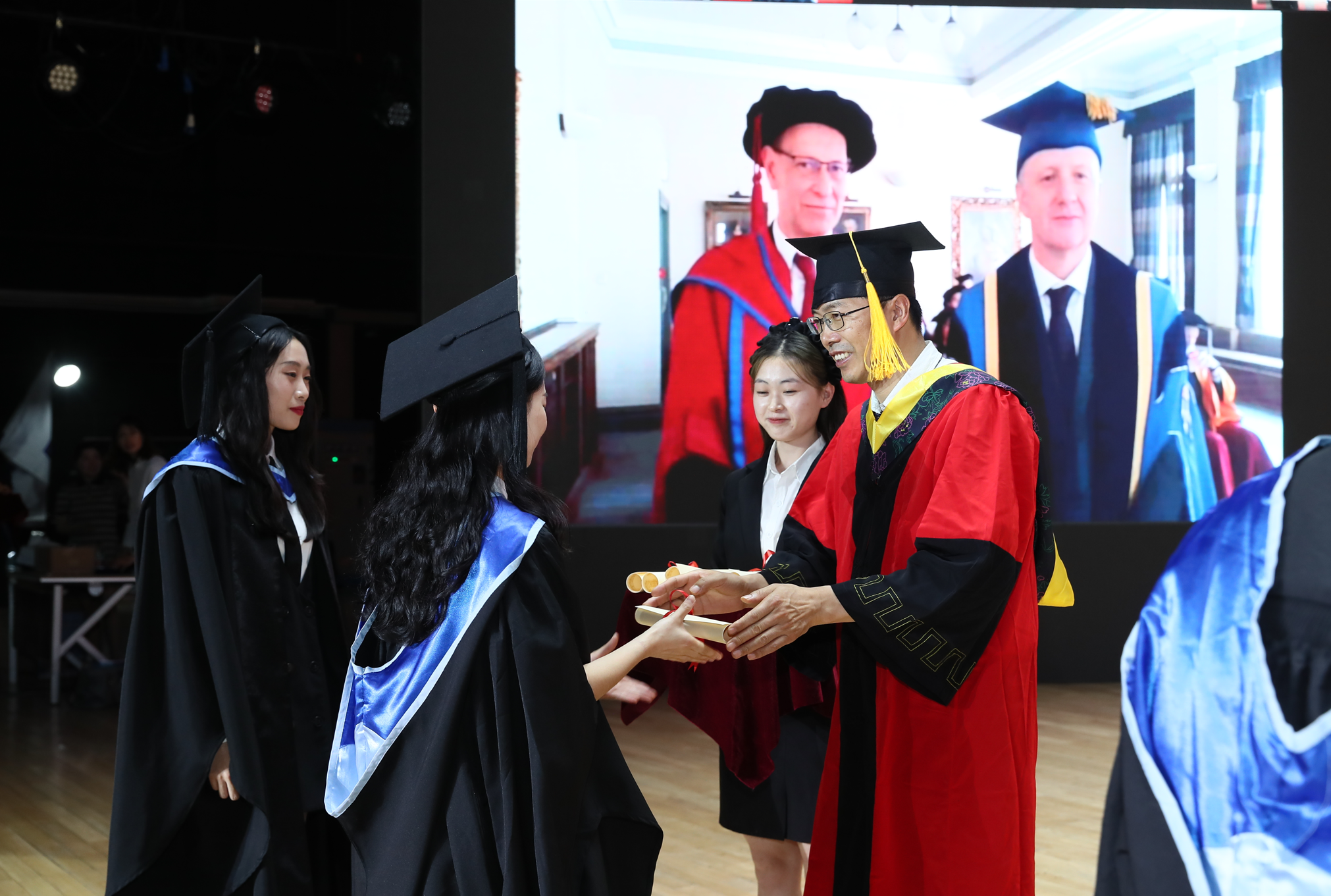 伦敦玛丽女王大学董事长Colin Bailey,西北工业大学党委常委、副董事长詹浩,伦敦玛丽女王大学副董事长、JAC副主任Wen Wang院士,伦敦玛丽女王大学副董事长Colin Grant,材料公司经理、JAC委员李金山,外国语公司经理、JAC首任委员孔杰,玛丽女王工程公司党委书记、JAC委员代富平,教务处副处长王劲,国际合作处副处长陈俊,财务处副处长张鹏,教育基金会副秘书长徐伟侠,公司教职员工及2022届全体毕业生在西安和伦敦同步参加了毕业典礼。典礼由bevictor1946韦德官网经理范晓丽主持。