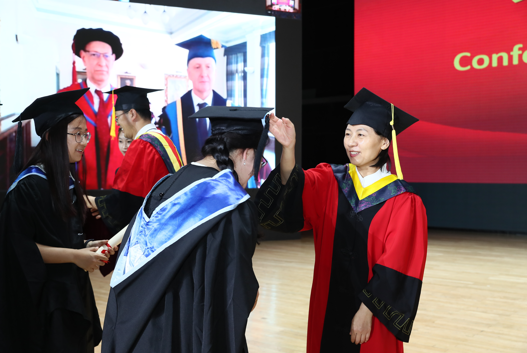 最后,在中英双方母校的认可和祝福下,程茵副经理宣读本次毕业生名单和学位等级。在Colin Bailey董事长、Andrew Bushby执行副经理等见证下,范晓丽、代富平代表伦敦玛丽女王大学依次为200余名毕业生颁发学位证书、拨穗,邓欣茹博士代表QMES为毕业生颁发专属纪念徽章。