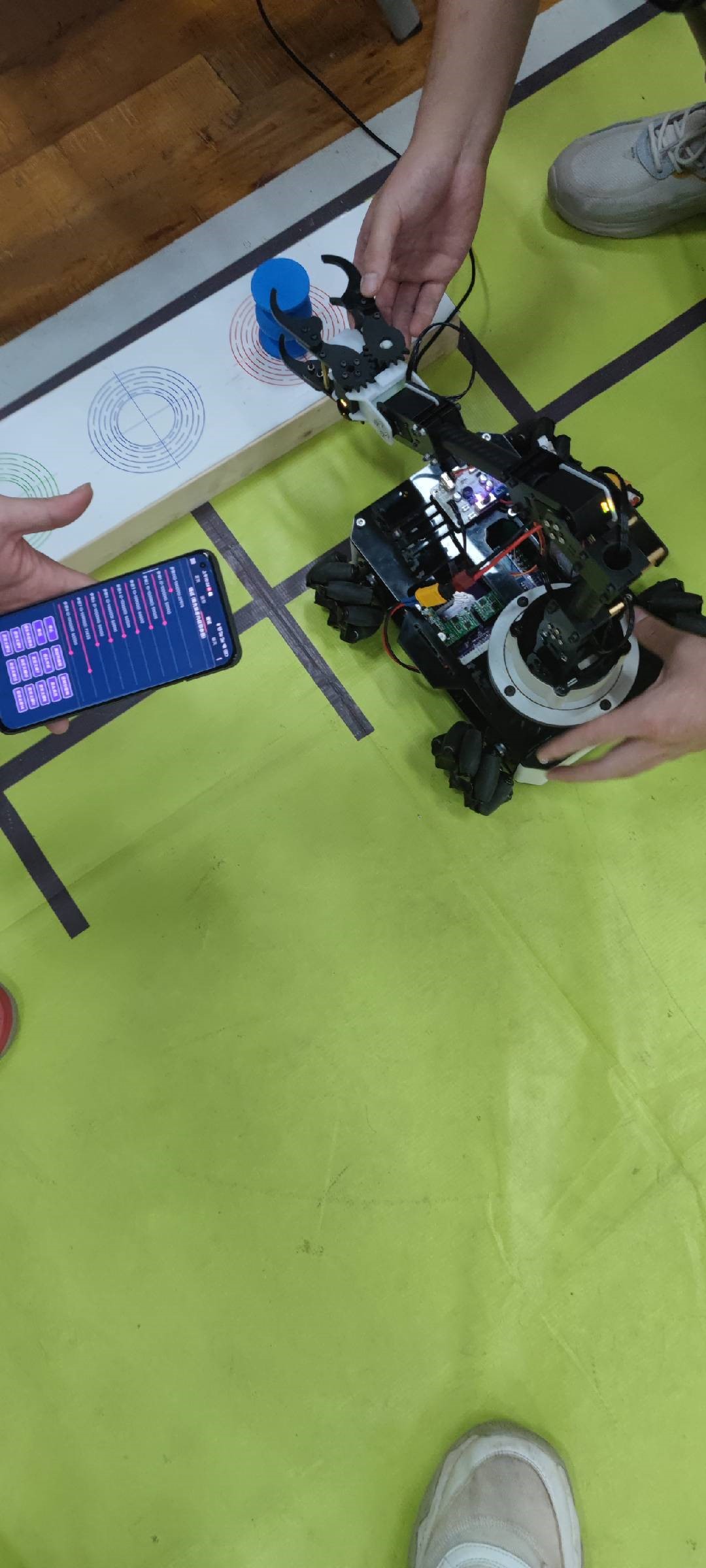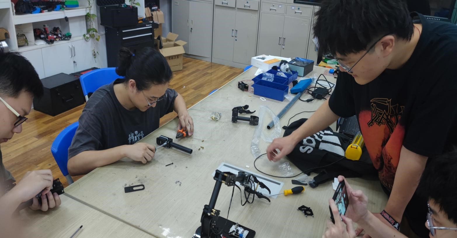 在智能机器人模块中,同学们在金凯乐老师的指导下学习使用Solidworks等设计软件,通过切割、焊接和3D打印等方法进行零件的制造,随后进行机械车的组装和调试工作。在比赛中,各小组自主设计了相应的程序,成功抓取物块并运输至指定地点,圆满完成了学习目标。
