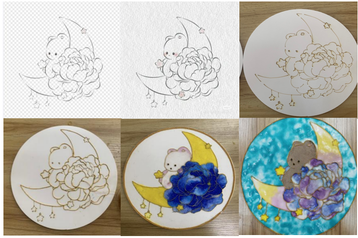在制作环节中,两位老师融合现代科学技术与中国传统工艺进行实践教学。同学们学习了二维工程软件及图像处理、非金属激光切割机的实践操作。在“喜迎二十大,奋进新征程,建功新时代”主题设计环节中,同学们运用所学知识和技术进行作品设计、图案切割并完成掐丝和上色。这一环节里,同学们不仅初步掌握了CAXA、AI等图像软件的使用和掐丝珐琅工艺流程,更厚植了爱党爱国的情怀,上了一堂生动的“思政课”。实习最后,同学们掌握了用立创软件进行电路设计的方法和小型电子产品焊接装配技术,展示并分享了作品成果。