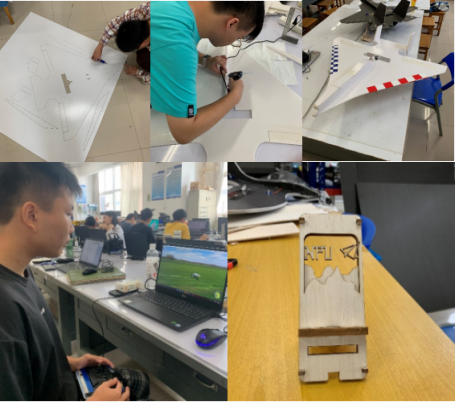 在航模创新设计生产实习模块中,同学们首先以小组为单位,使用模拟飞行软件体验了第三视角下航模飞机的五边飞行过程。在李晓光老师的指导下,学习使用CAXA软件设计绘制手机支架,通过激光切割机切割并完成组装。