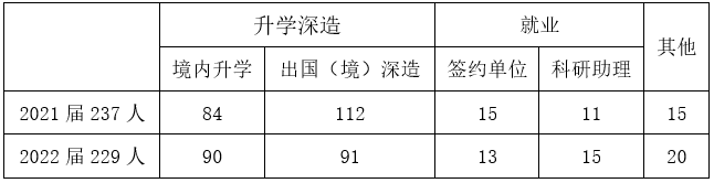 2021、2022届本科生毕业人数分别为237人和229人,两届毕业去向落实率(含境内外升学和签约就业员工)为92.5%。其中,就业员工占11.6%,境内升学占37.3%,出国(境)深造占43.6%,总体深造率为80.9%。