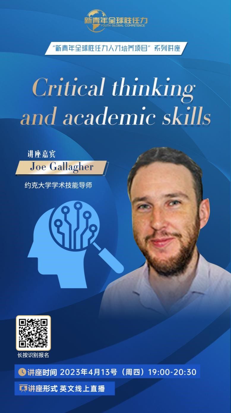 Joe Gallagher(乔·加拉格尔)老师是批判性思维领域的专家,对不同文化和语言环境中的思维有独特的视角和研究。其语言幽默风趣,思考问题角度新颖、见解独到,可以将批判性思维意识和能力通俗易懂的展现在大家面前。本场讲座,Joe Gallagher老师将就“Critical thinking and academic skills”主题进行深度分析和解读,通过通俗易懂的语言,深入浅出的从解析批判性思维意识和能力。
