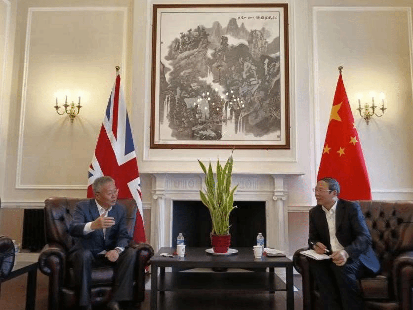 万小朋与匡建江会谈,代表团与中国驻英大使馆同事合影