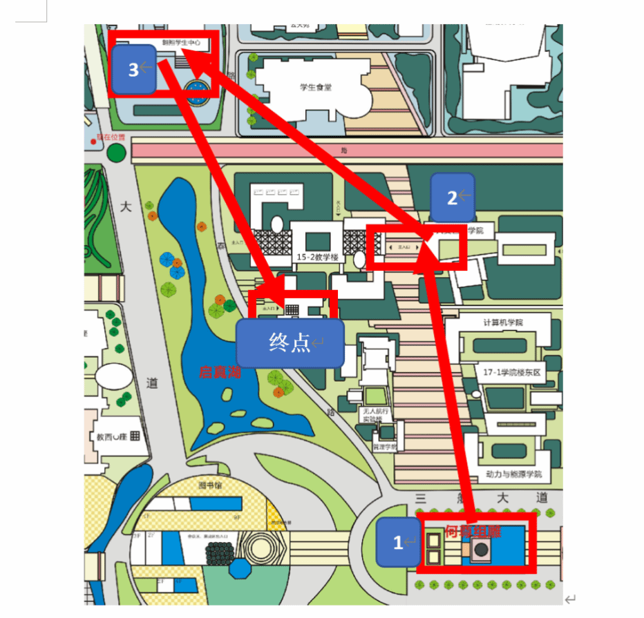 2023年5月7日下午14:00,活动在何尊广场准时开始。参赛同学根据地图上模拟的长征路线图的指示选择寻找不同的藏宝地点。(地图如下所示)