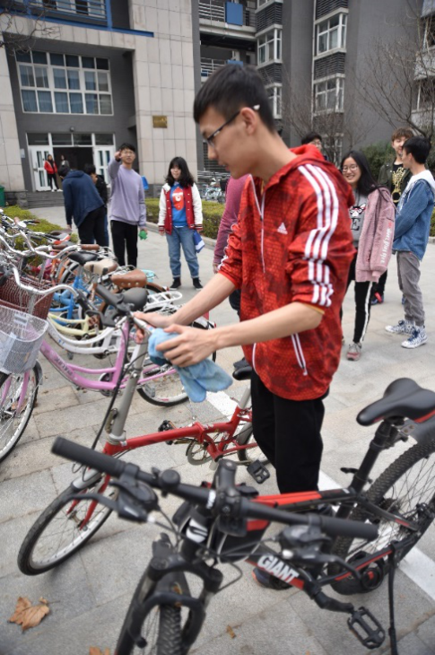 QM021702团支书将同学们分为两组,男同学负责擦洗摆放星天苑G座楼下的自行车,女同学负责星天苑B座楼下的自行车。同学热情参与,积极响应,纷纷贡献出了自己的抹布、水桶、洗洁精,从宿舍中走出来参与到这次的公益活动中。活动中,同学们积极踊跃,一丝不苟,涌现出了多个先锋榜样:一直为大家淘洗擦车布的林北辰,积极主动整理自行车的张潇洋,擦车先锋隋尚林,搬运工具器材的大班长刘扬……