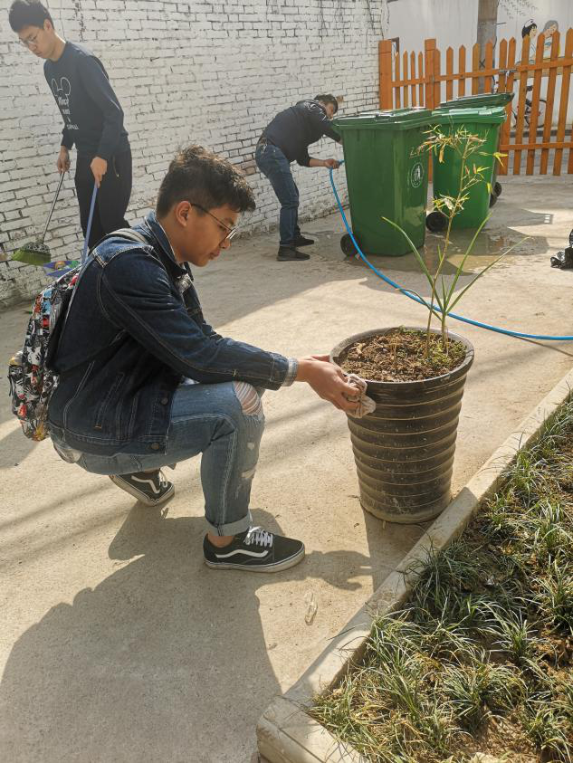 在爱心护理院内,全体同学首先帮忙清理了护理院的院落,并在护理人员的安排下各司其职。金硕、王凤朝、夏云昊等同学负责冲洗大门;粟毅、刘玉龙、肖阳等同学对地面进行了清扫,整理垃圾;其余几位同学悉心地擦洗了花盆、空调等物品。暖暖的春日阳光,为同学们加上了金色的滤镜。