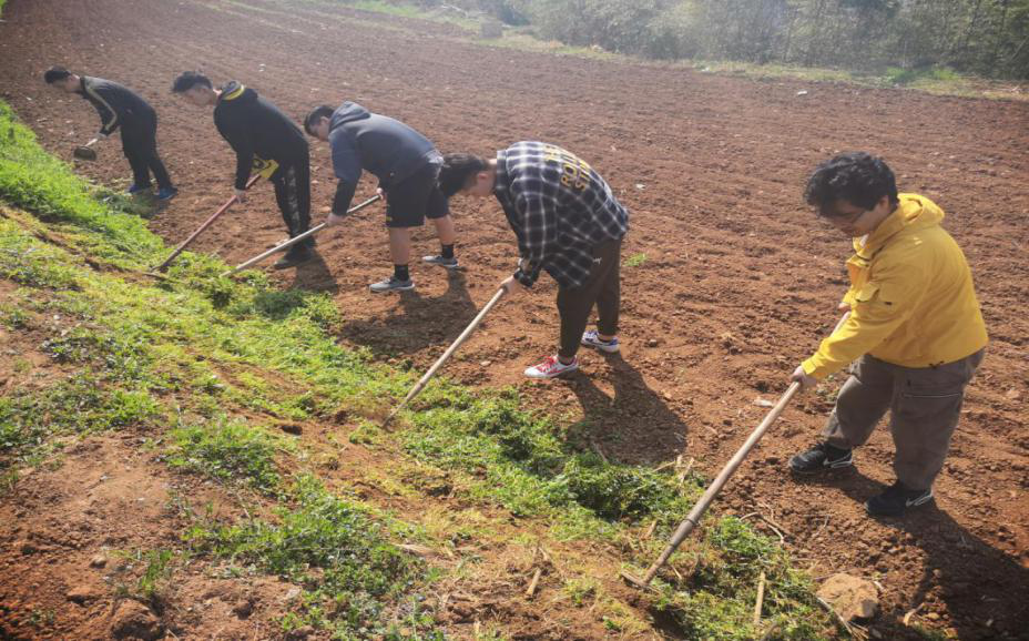 此次的任务分为除杂草和平整田垄,男生分为两组,郑安川带队负责除杂草,祝嘉浩带队负责平整田垄。