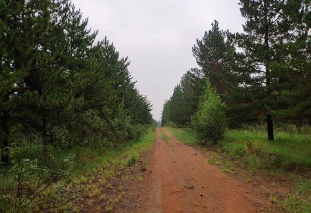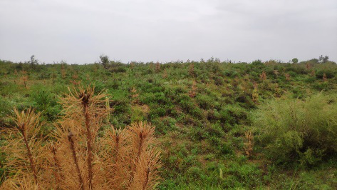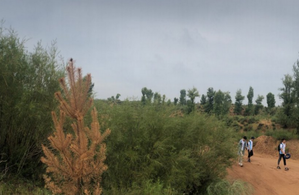随后,实践队全体成员按计划前往毛乌素沙漠。由于毛乌素沙漠覆盖的范围较大,所以实践队决定前往两个不同的地点分别进行考察。从早上起一直小雨作伴,使得本就不好走的沙路变得更加泥泞不堪,队员们搭乘的汽车也不得不在距离目的地1.5公里之外的地方停车。一路走来大家脚上都沾满了泥,最终见到了毛乌素“沙漠”。经过多年的治理,如今的毛乌素沙漠已经不适合再被称为“沙漠”,满眼望去尽是绿色的植被,地表基本已经被灌木和草覆盖,并有许多的松树与杨树,极少见大片的裸露沙地,环境有了极大的改善。在未来随着树木灌木的进一步成长,固沙与改善土壤的功效会更棒,风沙会进一步减少。