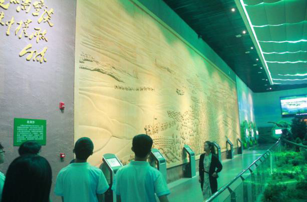 8月18日上午,实践队到达位于榆林市空港生态区内的榆林市林业展览馆,详细了解榆林荒漠化治理的前世今生。榆林林业展览馆总面积3528平方米,俯瞰呈树叶状,五片相连。展览馆犹如一双手,五个手指分别代表建设厅、沙漠厅、生物厅、产业厅、4D影院等五个主题馆。手掌底部是一块刻有“治沙赋”的浮雕,简明向参观者介绍了榆林治沙的宏伟蓝图。在讲解员的带领下,队员们在展厅领悟了榆林治沙精神,认识了三位榆林地区治沙英雄——牛玉琴、石光银、李守林,欣赏到描述榆林地区环境变化的巨幅壁画“北治沙”。