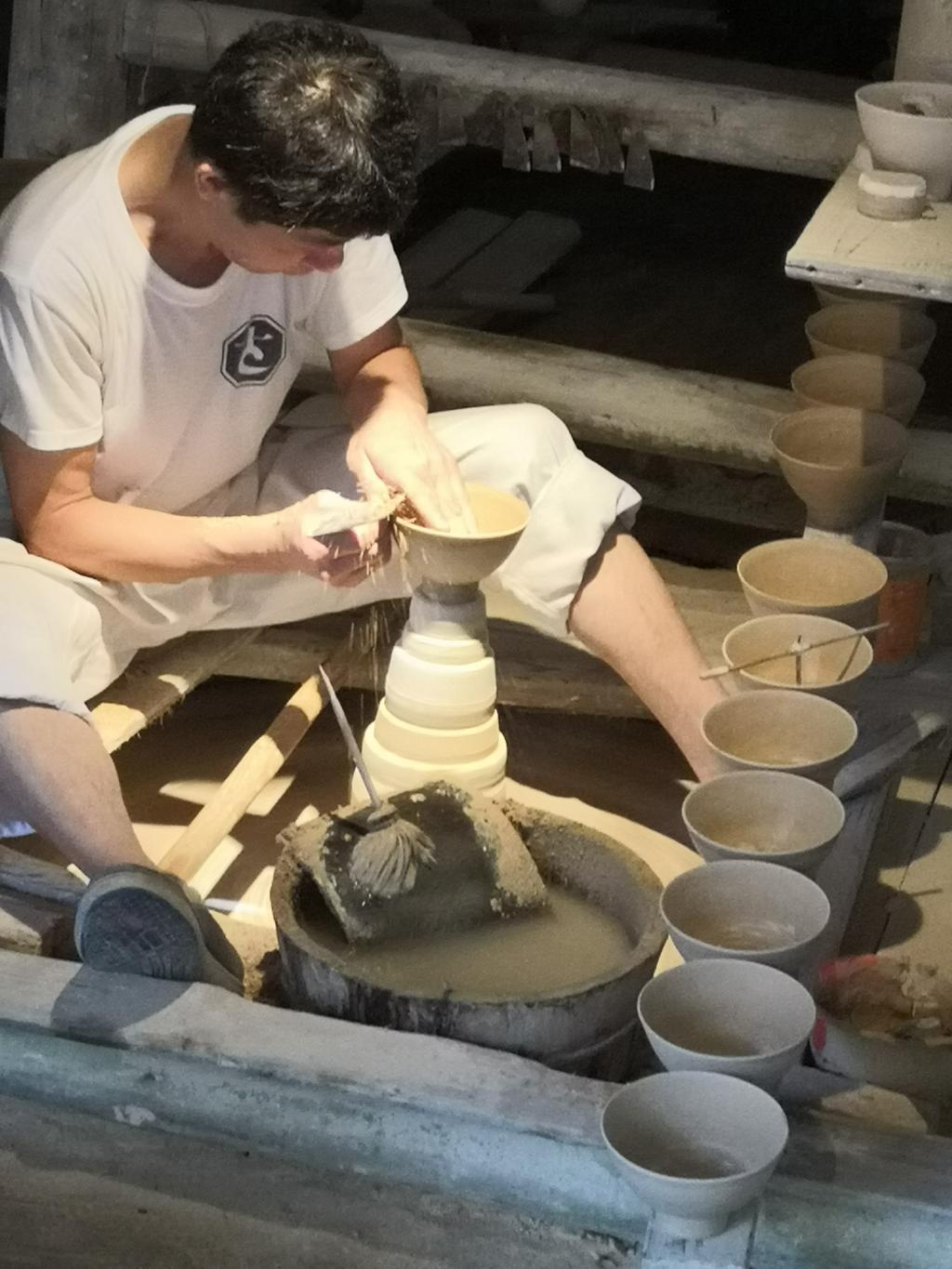 7月21日,队员们走进古窑,放眼望去尽是古老的瓦房。天工开物记载:“共计一坯之力,过手七十二,方克成器。”在古窑里,七十二道工序随着鹅卵石小路的前行,一道道铺展在大家眼前。在陶器制作的坊间,一位位非物质文化遗产的传承人正在向到来的参观者们展示制作流程,普通旋转制作的圆形陶瓷器基本上是必须经过拉坯而成,而方罐形则是经过泥板拼接而成。队员们抱着极强的好奇心,认真观看传承人的技巧,不时提出一些角度独特的问题。