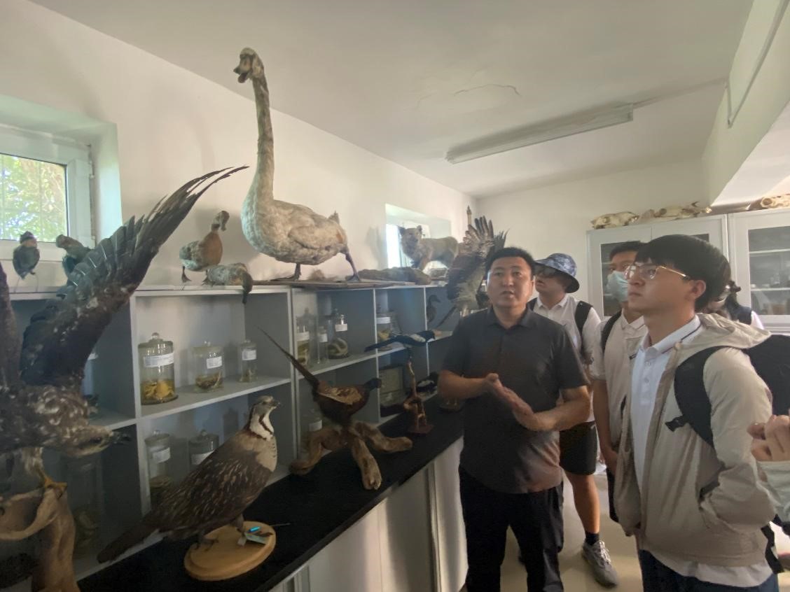 当日下午,在新疆环境保护研究院工作人员带领下,实践队前往国家环境保护准噶尔荒漠绿洲交错区科学观测研究站参观。新疆准噶尔生态环境观测研究站以建立环境背景数据库、开展生态环境现状及生物多样性定位观测研究为主要任务,在近10年的基础设施建设和观测研究能力提升中,逐步具备荒漠生态学、绿洲生态学及污染生态学等学科的研究能力,形成多尺度、全面、长期连续监测,模拟和解决多学科交叉问题的能力,为生态环境管理提供了基础支撑。科学观测研究站站长阿迪力首先带领实践队参观了土壤重金属污染修复植物种质资源库与动植物标本馆。种类丰富的动植物标本让同学们深刻感受到新疆地区的生物多样性,充分彰显研究站科普教育功能。