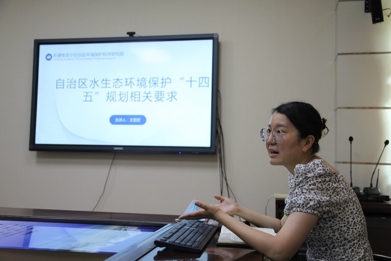 新疆环境保护研究院王显丽博士结合自治区生态环境保护“十四五”规划为实践队员做了水环境保护主题的科普报告。王显丽从防治办法、建设成果、规划目标、工作任务及重点工程五个方面进行介绍。她提到,新疆生态环境建设已经取得一定成效,仍存在亟需解决的重点问题,期待新时代中国青年为祖国的生态文明建设谱写崭新篇章。最后,王显丽就水资源保护、开发与利用等一系列问题向同学们的提问进行详细解答。