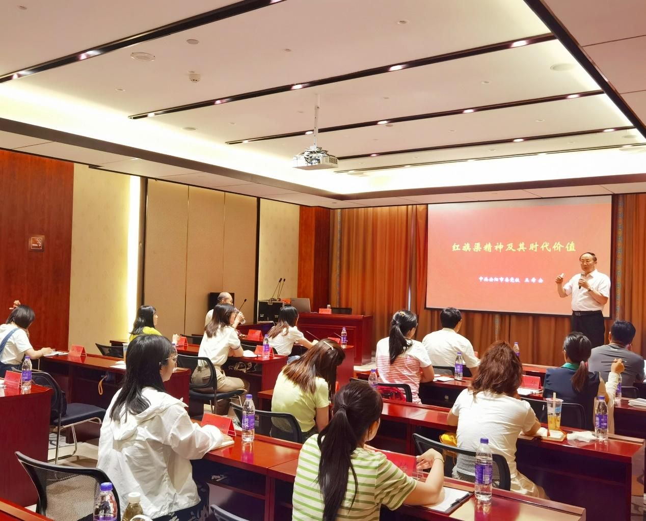 抵达林州后,首先由原中共安阳市委党校副董事长王希安讲授题为《红旗渠精神及其时代价值》的专题讲座,他介绍了林县旱灾之重、红旗渠修建之难、林县人民战天斗地之勇,讲述了在不可能的时间、不可能的地方建成不可思议的红旗渠的全过程,让全体教职工对红旗渠精神有了初步的认识和了解。