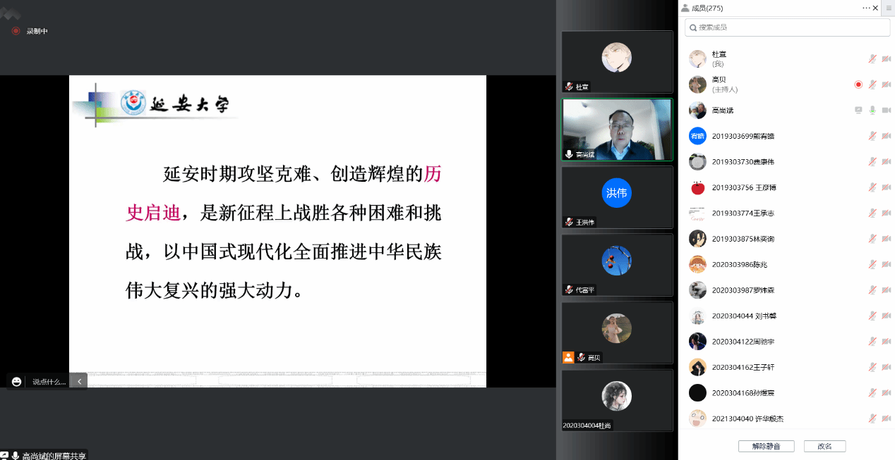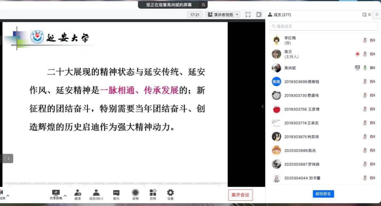 高教授讲到党的二十大展现的精神状态与延安传统、延安作风、延安精神是一脉相通、传承发展的。新征程的团结奋斗,特别需要当年团结奋斗、创造辉煌的历史启迪作为强大精神动力。今天的我们只有认清新情势,才能理解习近平总书记关于继承和发扬延安传统、延安作风、延安精神的新要求。