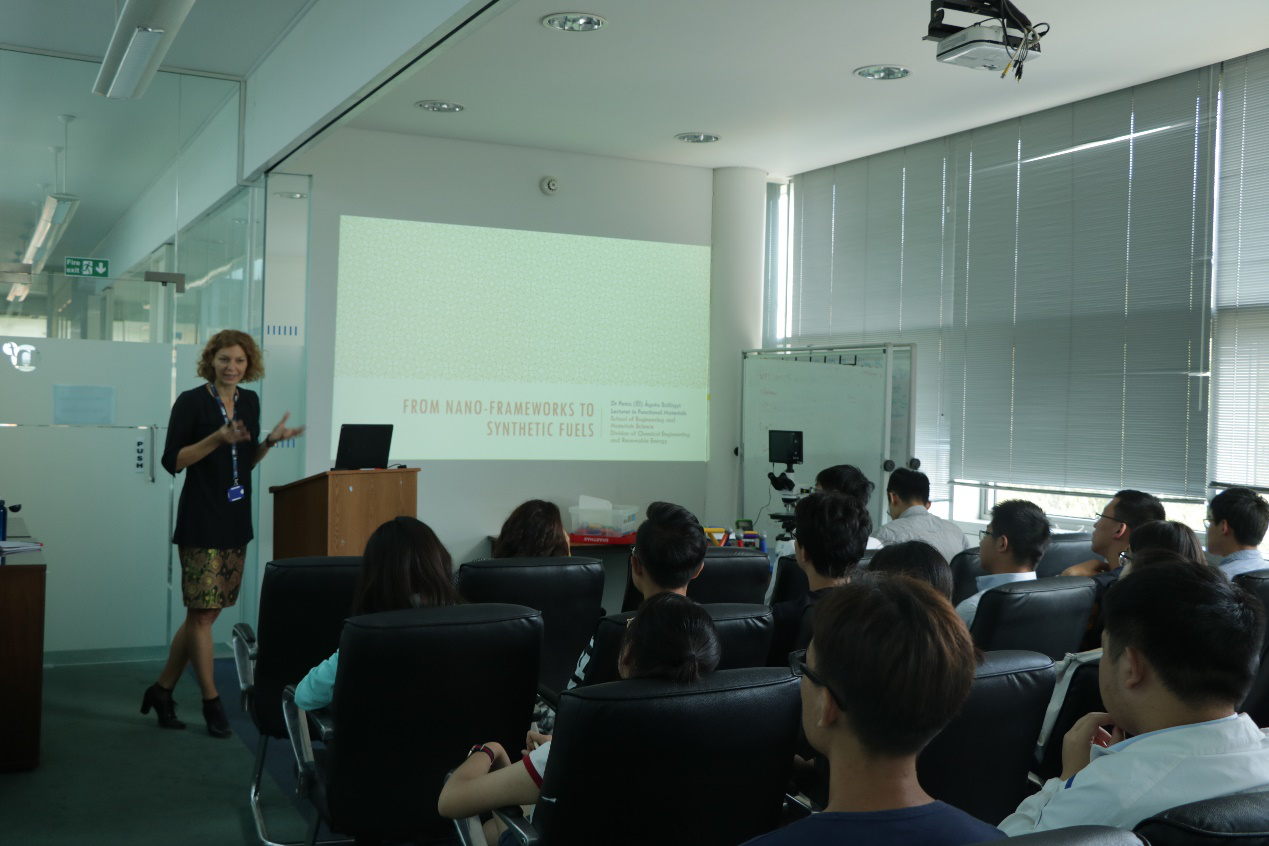 8月8日,Dr.Oliver Fenwick为同学们带来了题目为“有机电子和热电技术”的讲座,帮助他们学习到导电聚合物、有机晶体管的有关知识及其应用。Dr.Petra Szilagyi“从纳米框架到合成燃料”讲座,通过分析化石燃料的优缺点,帮助同学们充分认识到开发新能源的必要性和紧迫性,并总结出解决能源问题的三种主要途径。为进一步帮助同学们探索新能源技术的前景,Dr.Ana Jorge Sobrido和Dr. Joe Briscoe又分别和同学们探讨了贮能材料和太阳能光伏材料的发展应用方向。