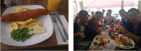 After the boating, we all got hungry, and the signboard outside cafe helped us a lot. As we find the typical Britain food–fish and chips on it. Thus, we had a very pleasant lunch. When we were having lunch, another student in Cambridge Summer Camp from QMES joined our group. He became our guide and helped us a lot.