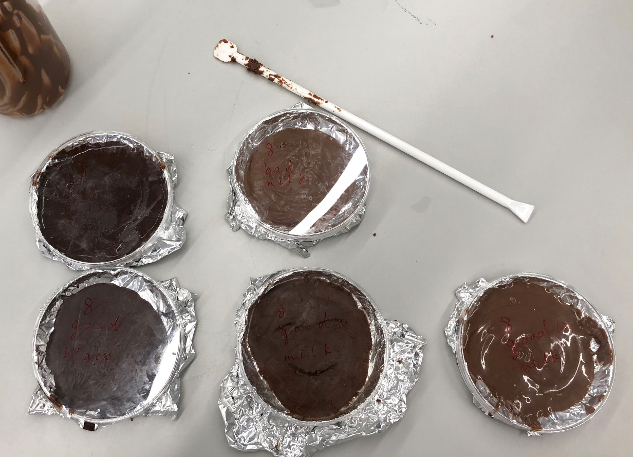 At the beginning of the session, Dr. Zhang gave us a lecture about the chocolates, including their history and crystal structures. Then, we were asked to make one good and one bad chocolate by using both dark and milk chocolates to see whether the physical and chemical properties would be different when we changed the crystal structure.