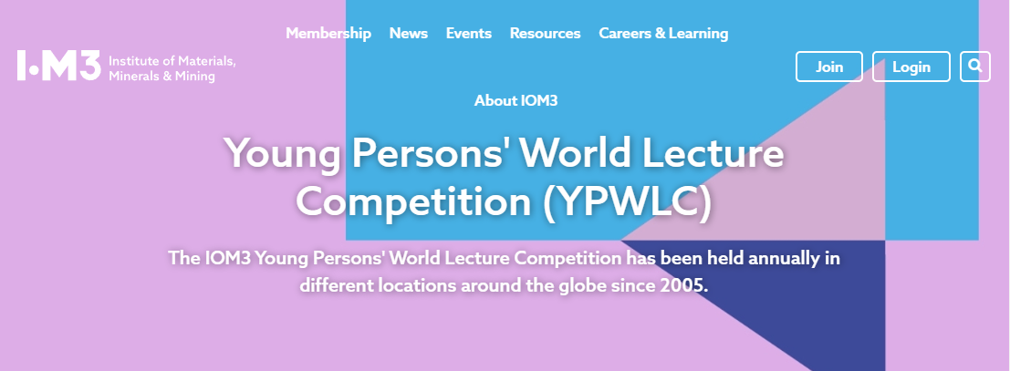 The IOM3 Young Persons’ Lecture Competition (YPLC) is organized by the Institute of Materials Minerals and Mining (IOM3) each year. The YPLC invites students and professionals up to the age of 28 to deliver a short lecture (12 to 15 minutes) on a topic related to materials, minerals, mining, packaging, clay technology, wood science or engineering.https://www.iom3.org/yplc
