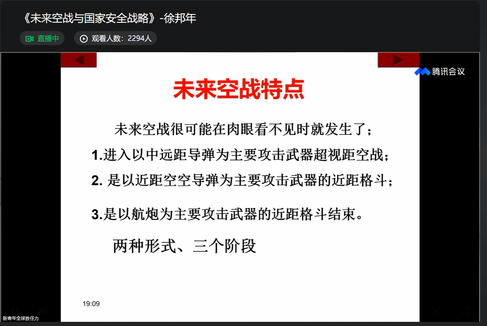 The main content of the second part of the lecture is future fighter. Professor Xu successively introduced the fighters of different periods and countries. He combined the video to introduce the flight attitude, design features and improvement details of different fighters and the role of different fighters in the air combat. After that, he introduced the characteristics of different missiles, and emphasized the importance of current precision strike technology and multi-target attack technology on the battlefield. Taking China’s fighter J-20 as an example, Professor Xu introduced the characteristics of future fighters.
