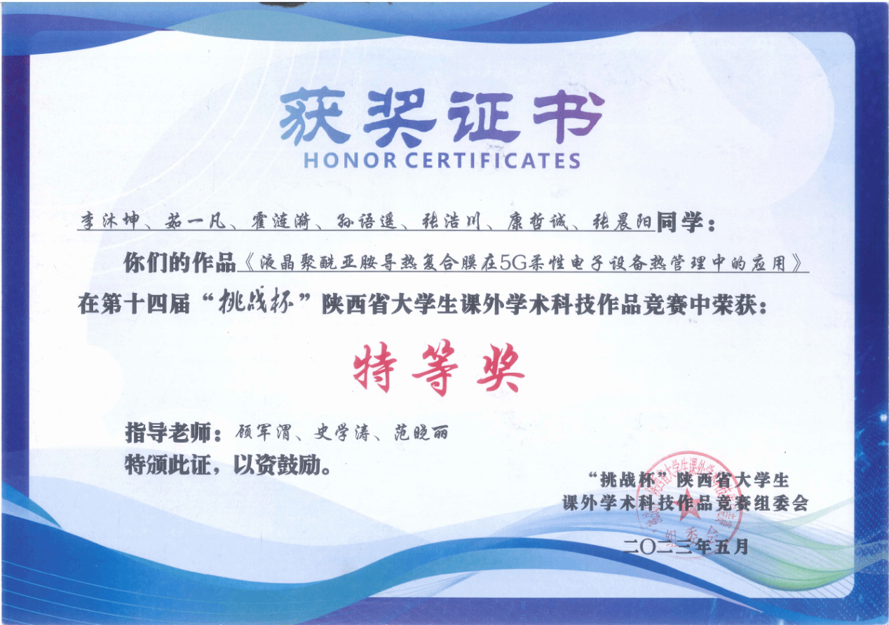 In May 2023, the closing and award ceremony of the 14th "Challenge Cup" Extracurricular Academic Science and Technology Works Competition of Shaanxi College Students hosted by Chang 'an University was successfully held in Weishui Campus of Chang 'an University, which was co-sponsored by Shaanxi Provincial Committee of the Communist Youth League, Shaanxi Provincial Education and Work Committee of the CPC Shaanxi Provincial Committee, Shaanxi Provincial Science and Technology Department, Shaanxi Provincial Science and Technology Association, Shaanxi Provincial Academy of Social Sciences, Shaanxi Provincial Students' Federation and Xixian New Area Management Committee. Two teams from QMES won the grand prize in the final for their projects "Nafu Intelligent Fabrication - High Performance Carbon Nanotube Aluminum Matrix Composite Material Prepared by Solid-liquid Method" and "Application of Liquid Crystal Polyimide Thermal Conductivity Composite Film in the Thermal Management of 5G Flexible Electronic Devices", delivering victories in the competition.