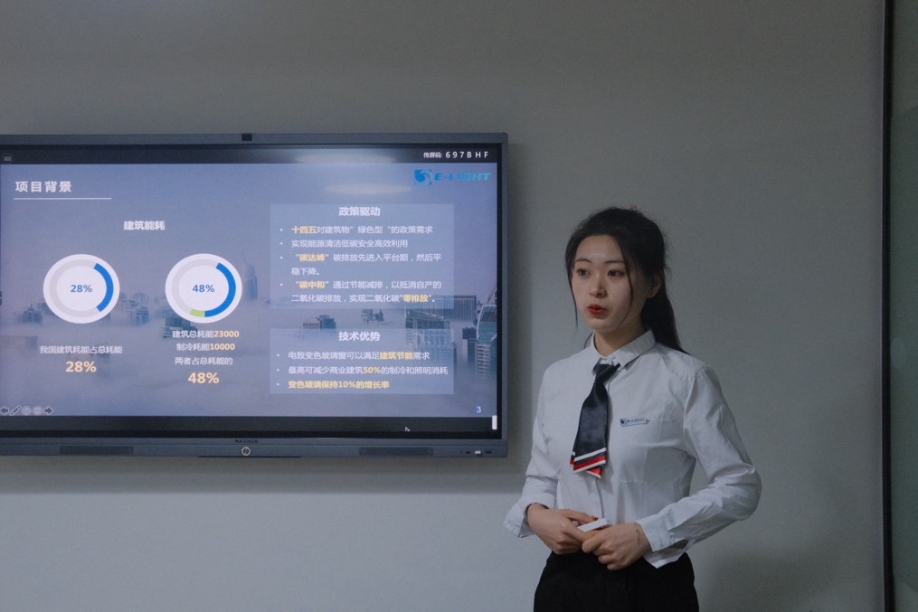 团队开发的自供能智能变色玻璃集成了“光谱选择透明光伏电池”“双金属基电致变色玻璃”和“能量集储智能控制系统”三项核心技术。项目通过透明光伏电池吸收并转化紫外线采集能量,将光能转化为电能驱动电致变色玻璃的变色和褪色,利用智能控制电路实现外界光线的感知与高性能电致变色玻璃的智能调控。产品具备高性能变色、自主供能、智能调节、一体化集成、美观实用等显著优点。项目聚焦建筑节能新方案,助力实现“碳达峰碳中和”,在建筑物幕墙、智能家居、汽车车窗等场景具有广泛应用和重要的社会意义。