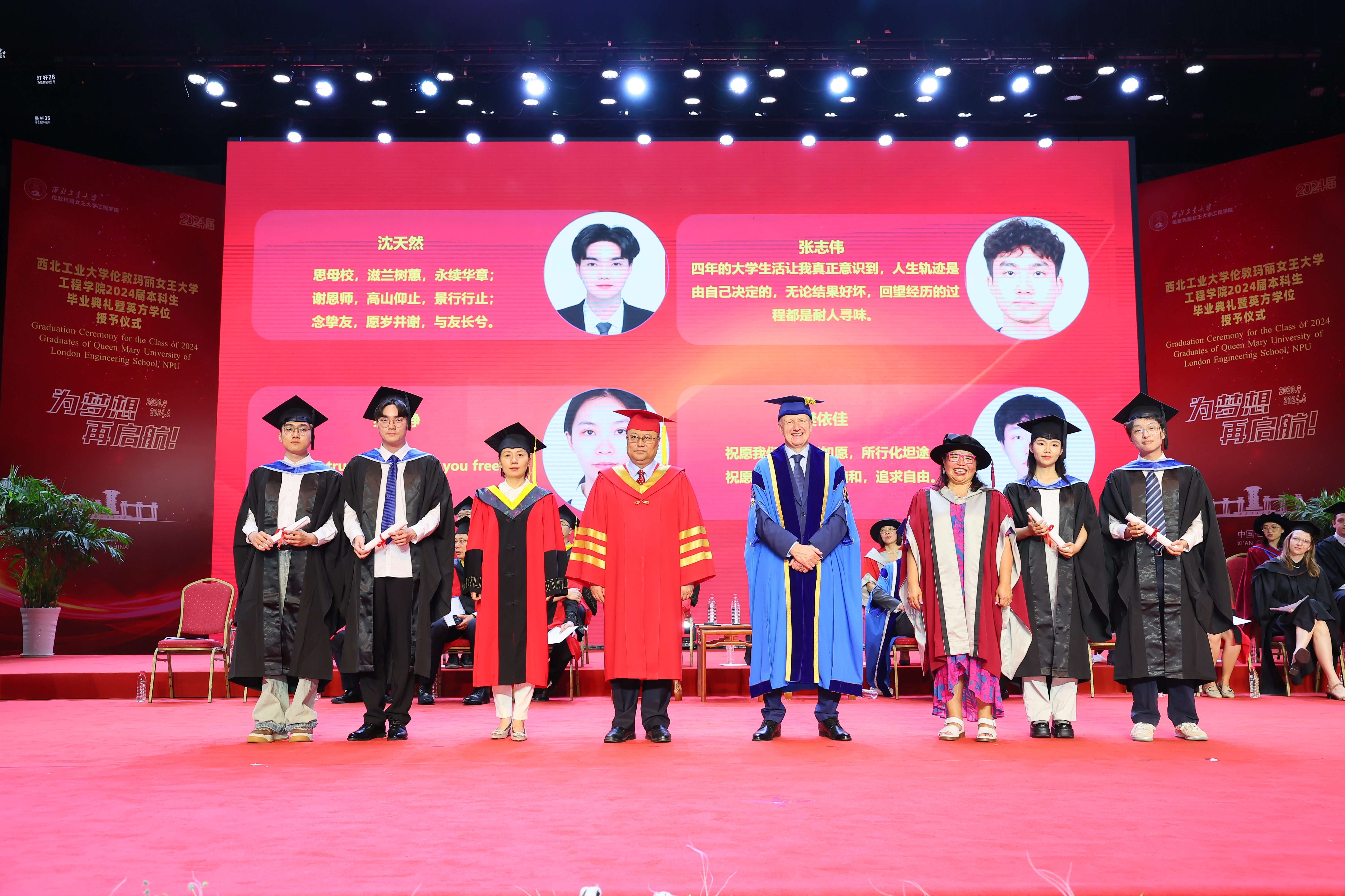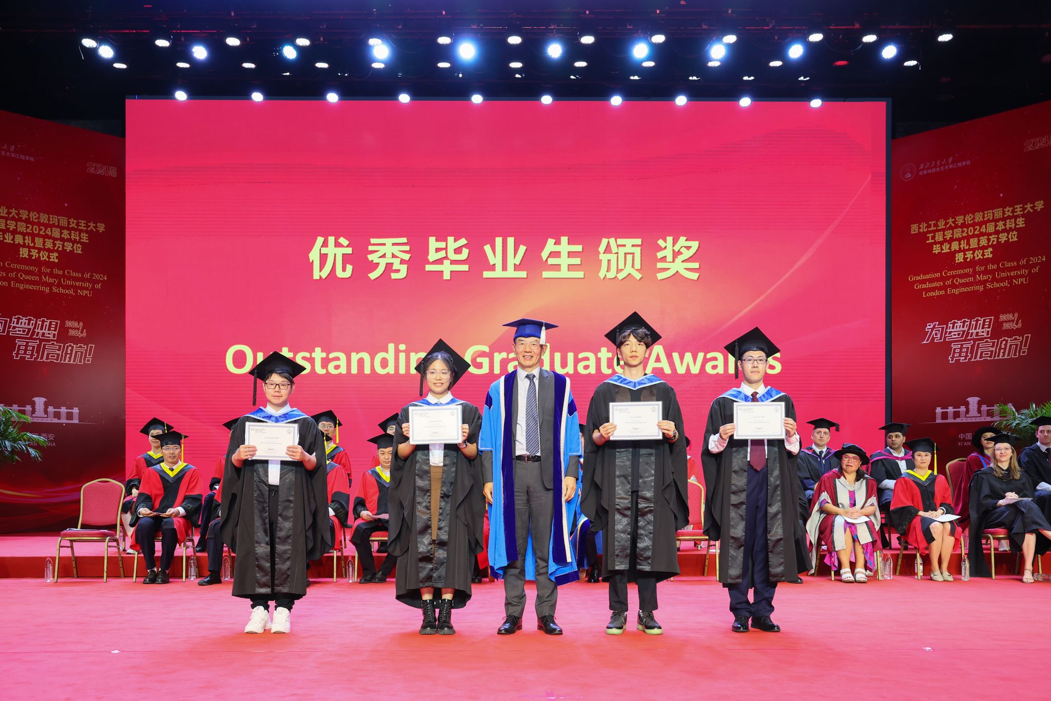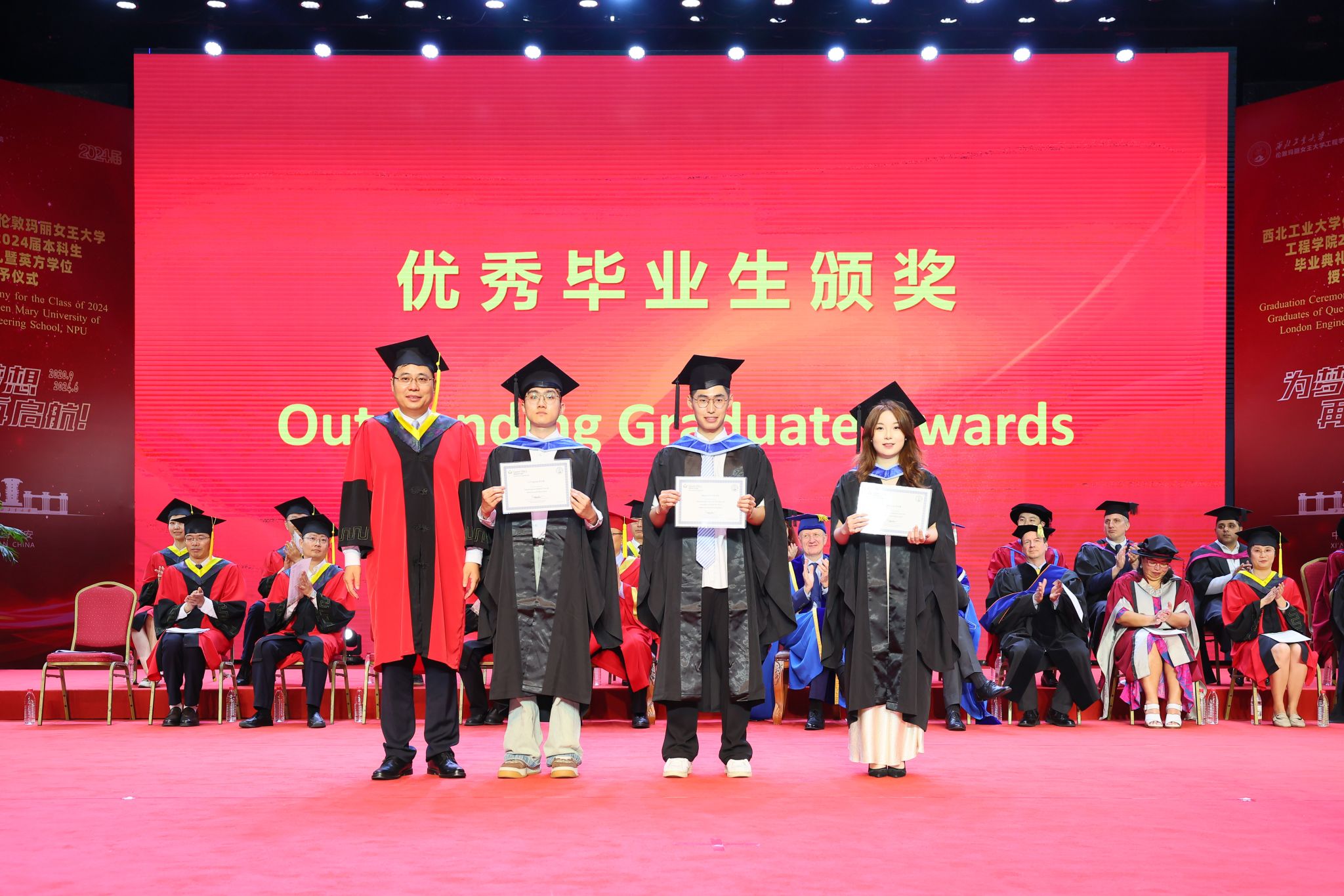 在两校的共同努力下,2024届毕业生表现优异。王文为陈少骞、殷岳浩、叶元茗、江梓歆同学颁发伦敦玛丽女王大学董事长奖荣誉证书;西工大国际合作处处长孔杰为孙语遥、李丰源同学颁发最佳论文奖荣誉证书,为张志伟同学颁发最佳进步奖荣誉证书;教务部部长王海鹏、校团委书记佘磊磊分别为薛垄琦、杨子涵、李昊等33名同学颁发西北工业大学优秀毕业生荣誉证书,对同学们在学业中取得的优异成绩表示祝贺。