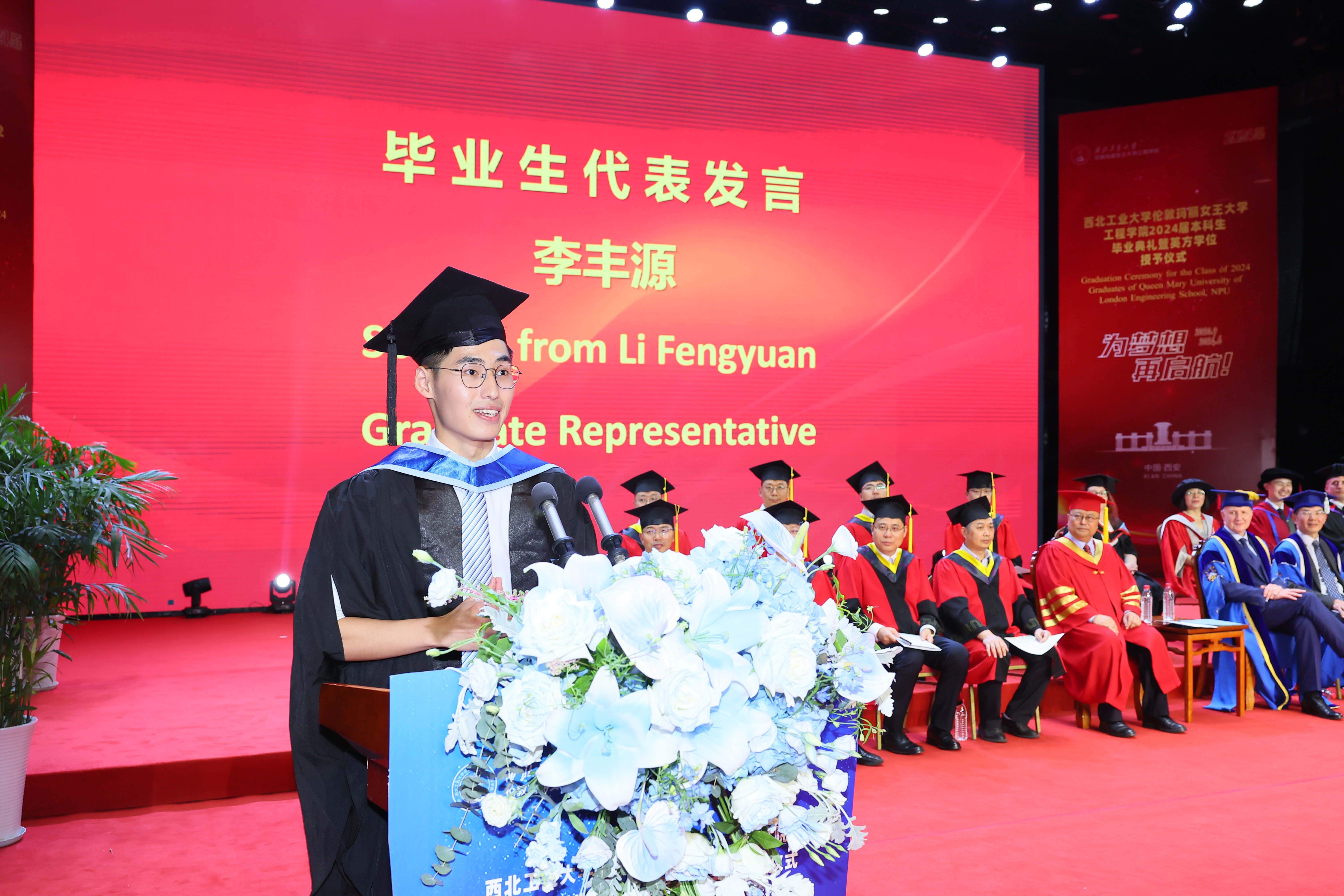 李丰源同学代表全体毕业生向悉心培育大家的母校、师长、家人和朋友表示感谢。他说,通过四年国际化的教育学习和实践交流,自身的跨文化交流能力与全球视野不断提升,将继续坚守初心,用实际行动在国家需要的领域书写更加璀璨的人生华章。