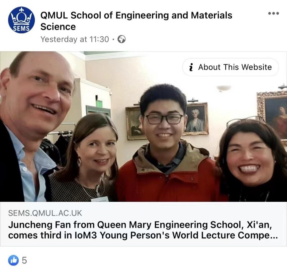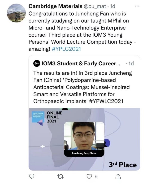 The lecture was held in 2005 firstly and has attracted the attention of the world academia for a long time. As the only player studying for a master’s degree and whose native language is not English, Fan Juncheng competed with doctoral students from the United Kingdom, South Africa, Russia, Malaysia, and Canada. There’s no doubt that it was very challenging. He took the“Polydopamine-based Antibacterial Coatings Mussel-inspired Smart and Versatile Platforms for Orthopedic Implants”as the subject of this lecture. This subject was co-directed by Professor Li Peng of NPU, Professor Liz Tanner, and Dr. Maria Romero-Gonzalez of QMUL. Besides, Fan Juncheng is one of the few students who have been shortlisted for the global finals with outstanding research results just at the undergraduate stage. Finally, he overcame the tremendous pressure, talked confidently, explained the subject, and answered the questions from the judges. As a result, he won third place and was rewarded with cash and a new version of the Macbook laptop. What made him even more proud was that his name appeared on the official website of the University of Cambridge and became a hot topic.