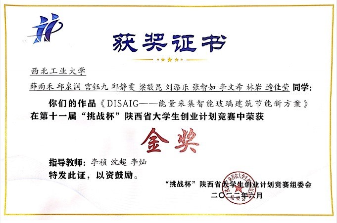 Recently, the 11th “Challenge Cup” Shaanxi Entrepreneurship Plan Competition, co-sponsored by the Shaanxi Provincial Committee of the Communist Youth League, the Education Working Committee of the Shaanxi Provincial Committee of the Communist Party of China, and the Shaanxi Provincial Department of Science and Technology, came to an end.The project “DISAIG - A New Energy-Saving Scheme for Intelligent Glass Building with Energy Collection” of the E-light student team composed of undergraduates Xue Yuhe, Qiu Quanrun, Gong Yujiu, Qiu Jingwen, Liang Jingkun, Lin Yan and Ti Jiaying from QMES, NPU won the gold award in the final, which continued the outstanding achievements of our undergraduates in the “Challenge Cup” series of events.