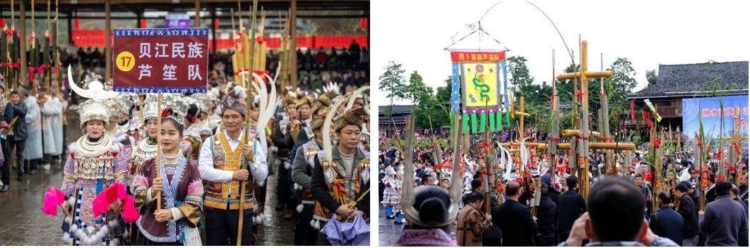 Performing customs of the Miao nationality always entails a special place, so playing Lusheng does. In Damiao Mountain, almost every village has a small field for collectively playing Lusheng and dancing. In the centre of the fields stands a Lusheng pillar carved in the shape of a coiling Dragon and a golden rooster. As the core of this cultural activity, the Lusheng pillar is an important carrier for inheriting national culture and a materialized representation of the belief of the Miao people. A series of such activities known as the Hillside Gala of the Miao nationality started from the 3rd day to the 19th day of the first lunar month.